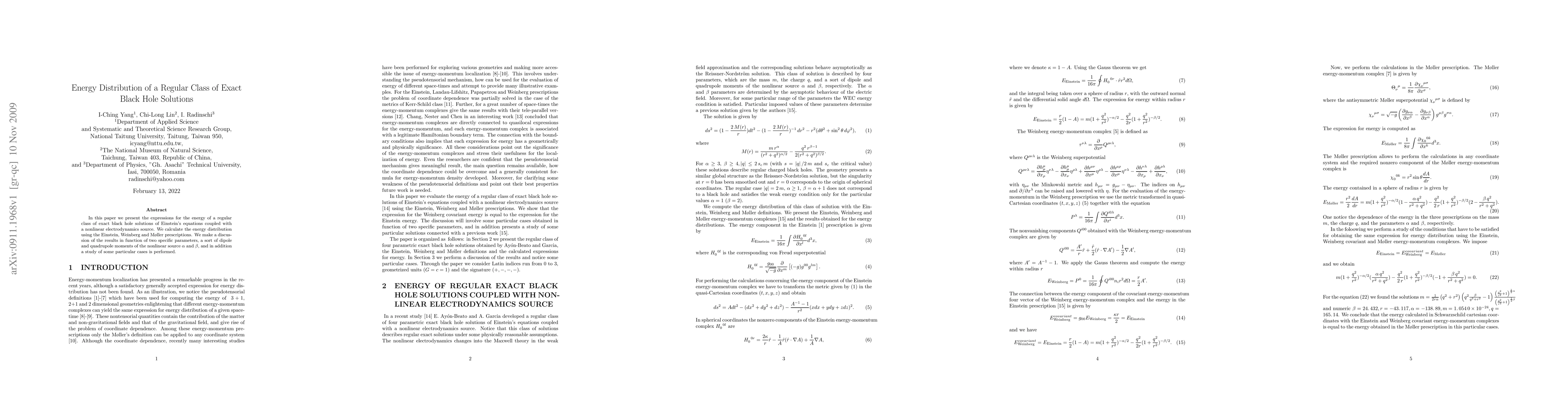 In this paper we present the expressions for the energy of a regular class of exact black hole solutions of Einstein's equations coupled with a nonlinear electrodynamics source. We calculate the energy distribution using the Einstein, Weinberg and M{\o}ller prescriptions. We make a discussion of the results in function of two specific parameters, a sort of dipole and quadrupole moments of the nonlinear source $\alpha$ and $\beta$, and in addition a study of some particular cases is performed.