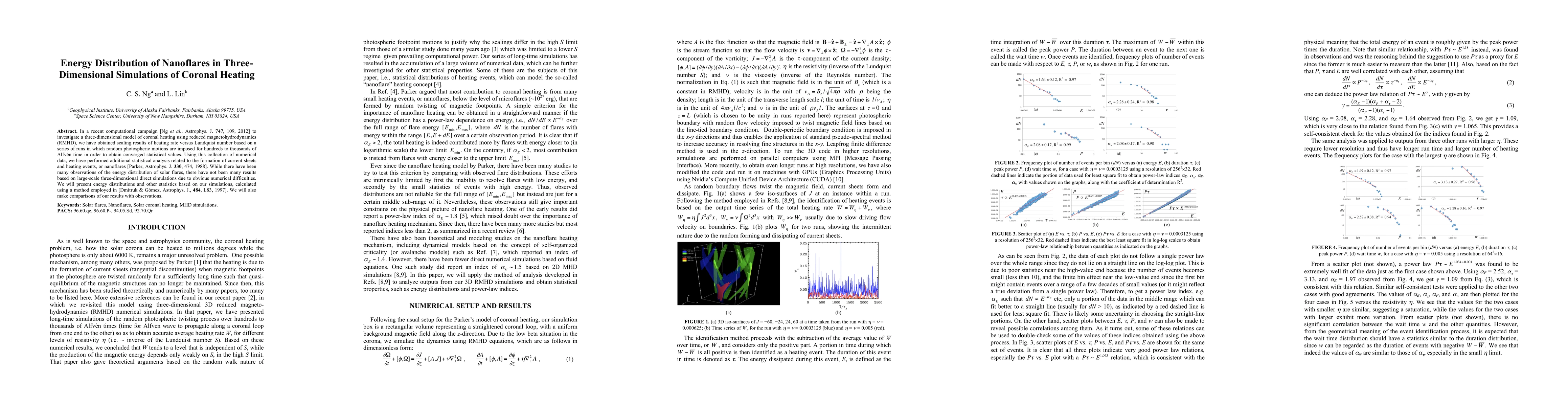 In a recent computational campaign [Ng et al., Astrophys. J. 747, 109, 2012] to investigate a three-dimensional model of coronal heating using reduced magnetohydrodynamics (RMHD), we have obtained scaling results of heating rate versus Lundquist number based on a series of runs in which random photospheric motions are imposed for hundreds to thousands of Alfv\'en time in order to obtain converged statistical values. Using this collection of numerical data, we have performed additional statistical analysis related to the formation of current sheets and heating events, or nanoflares [Parker, Astrophys. J. 330, 474, 1988]. While there have been many observations of the energy distribution of solar flares, there have not been many results based on large-scale three-dimensional direct simulations due to obvious numerical difficulties. We will present energy distributions and other statistics based on our simulations, calculated using a method employed in [Dmitruk & G\'omez, Astrophys. J., 484, L83, 1997]. We will also make comparisons of our results with observations.