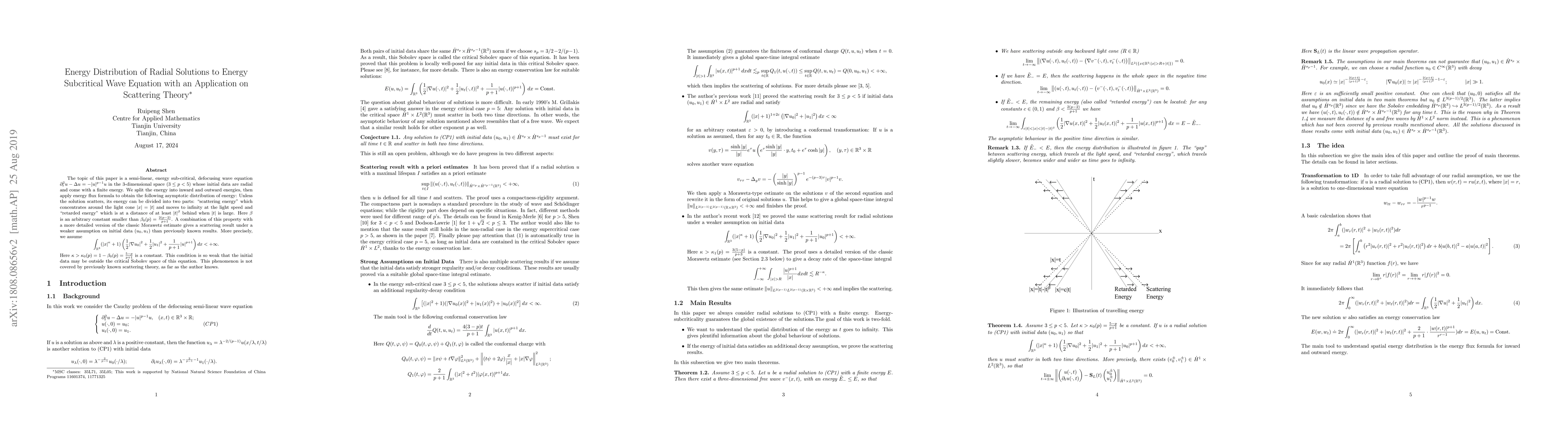 The topic of this paper is a semi-linear, energy sub-critical, defocusing wave equation $\partial_t^2 u - \Delta u = - |u|^{p -1} u$ in the 3-dimensional space ($3\leq p<5$) whose initial data are radial and come with a finite energy. We split the energy into inward and outward energies, then apply energy flux formula to obtain the following asymptotic distribution of energy: Unless the solution scatters, its energy can be divided into two parts: "scattering energy" which concentrates around the light cone $|x|=|t|$ and moves to infinity at the light speed and "retarded energy" which is at a distance of at least $|t|^\beta$ behind when $|t|$ is large. Here $\beta$ is an arbitrary constant smaller than $\beta_0(p) = \frac{2(p-2)}{p+1}$. A combination of this property with a more detailed version of the classic Morawetz estimate gives a scattering result under a weaker assumption on initial data $(u_0,u_1)$ than previously known results. More precisely, we assume \[ \int_{{\mathbb R}^3} (|x|^\kappa+1)\left(\frac{1}{2}|\nabla u_0|^2 + \frac{1}{2}|u_1|^2+\frac{1}{p+1}|u|^{p+1}\right) dx < +\infty. \] Here $\kappa>\kappa_0(p) =1-\beta_0(p) = \frac{5-p}{p+1}$ is a constant.