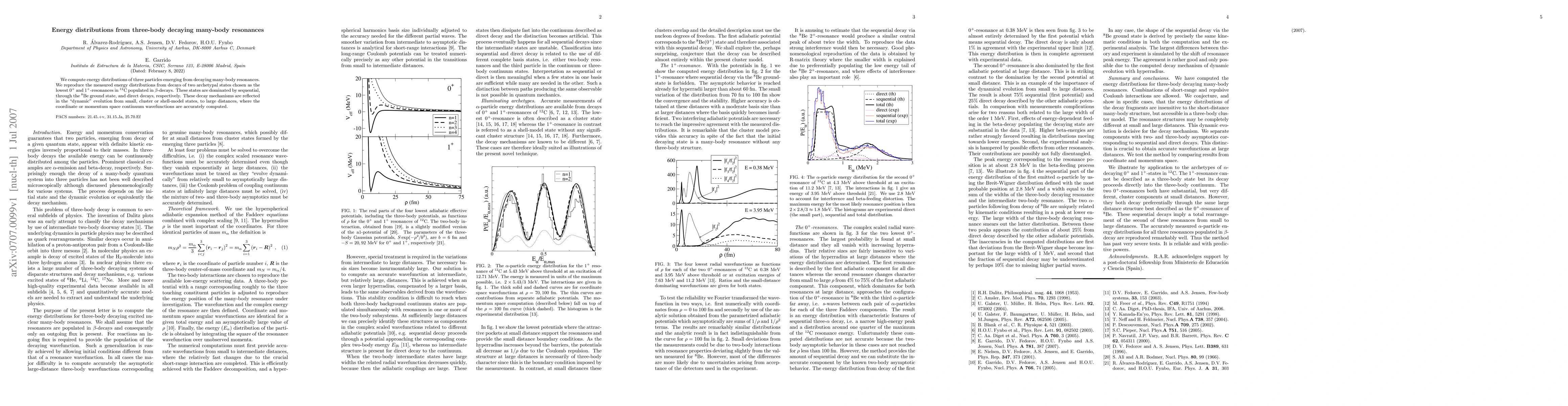 This research computes energy distributions of three-particle decays from many-body resonances in $^{12}$C, focusing on the lowest $0^{+}$ and $1^{+}$ resonances. It accurately reproduces measured distributions, reflecting sequential and direct decay mechanisms through $^{8}$Be ground state and continuum wavefunctions.