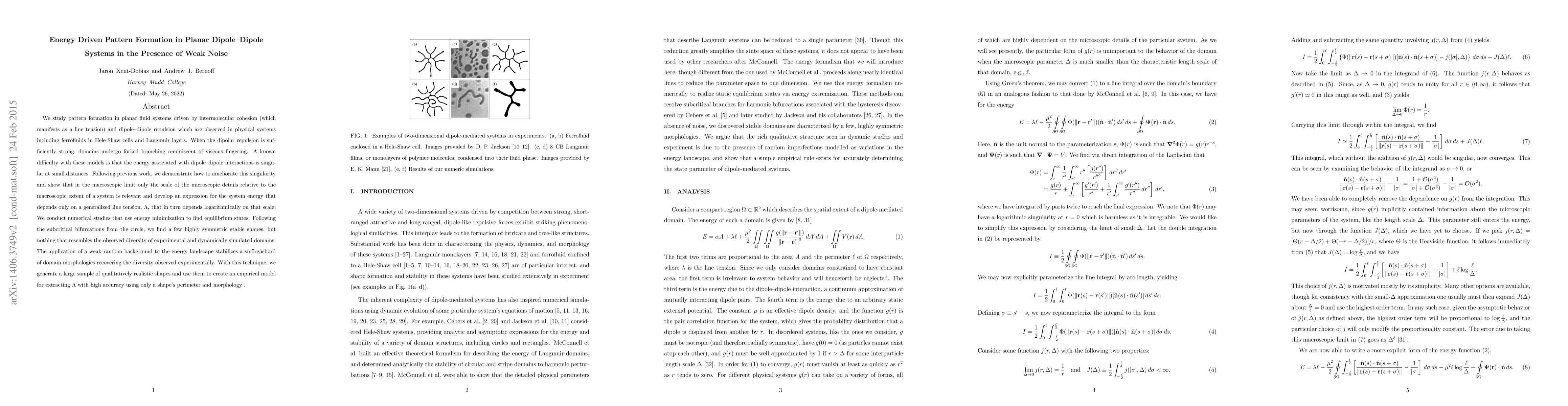 This research investigates pattern formation in planar dipole-dipole systems, such as ferrofluids, where cohesion and repulsion lead to forked branching. The study resolves singularities in dipole-dipole interaction energy and identifies a generalized line tension, Λ, for energy characterization. Weak noise applied to the system's energy landscape yields a variety of stable domain shapes that match experimental observations, enabling an empirical model for accurately extracting Λ from shape data.