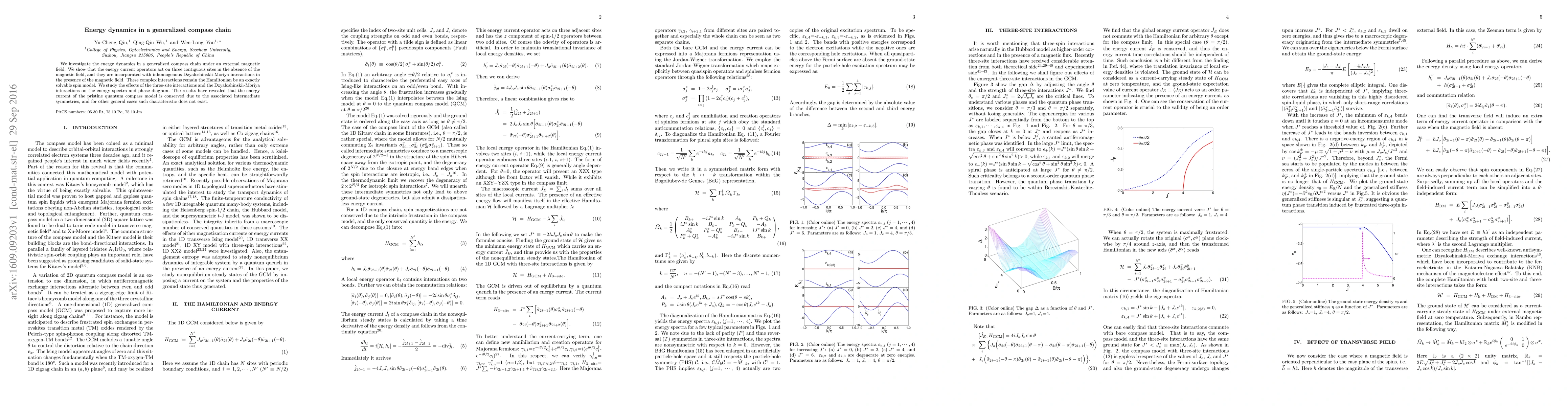 We investigate the energy dynamics in a generalized compass chain under an external magnetic field. We show that the energy current operators act on three contiguous sites in the absence of the magnetic field, and they are incorporated with inhomogenous Dzyaloshinskii-Moriya interactions in the presence of the magnetic field. These complex interactions remain the Hamiltonian be an exactly solvable spin model. We study the effects of the three-site interactions and the Dzyaloshinskii-Moriya interactions on the energy spectra and phase diagram. The results have revealed that the energy current of the pristine quantum compass model is conserved due to the associated intermediate symmetries, and for other general cases such characteristic does not exist.