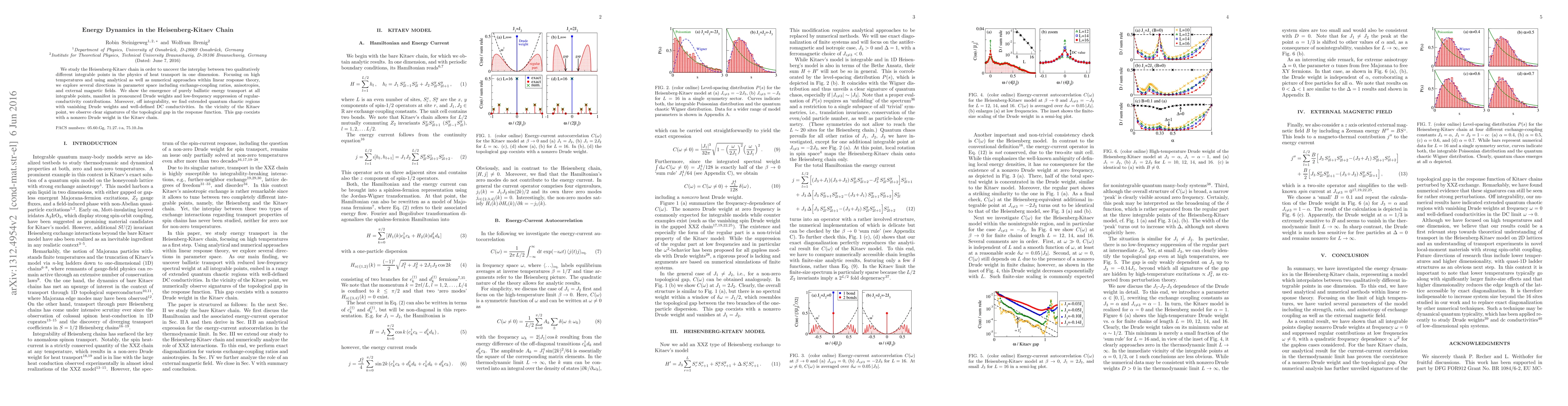 This paper investigates the energy dynamics in the Heisenberg-Kitaev chain, revealing ballistic energy transport at integrable points through high-temperature studies and linear response theory. Off integrability, quantum chaos regions exhibit vanishing Drude weights, while near the Kitaev point, a topological gap emerges alongside a nonzero Drude weight.
