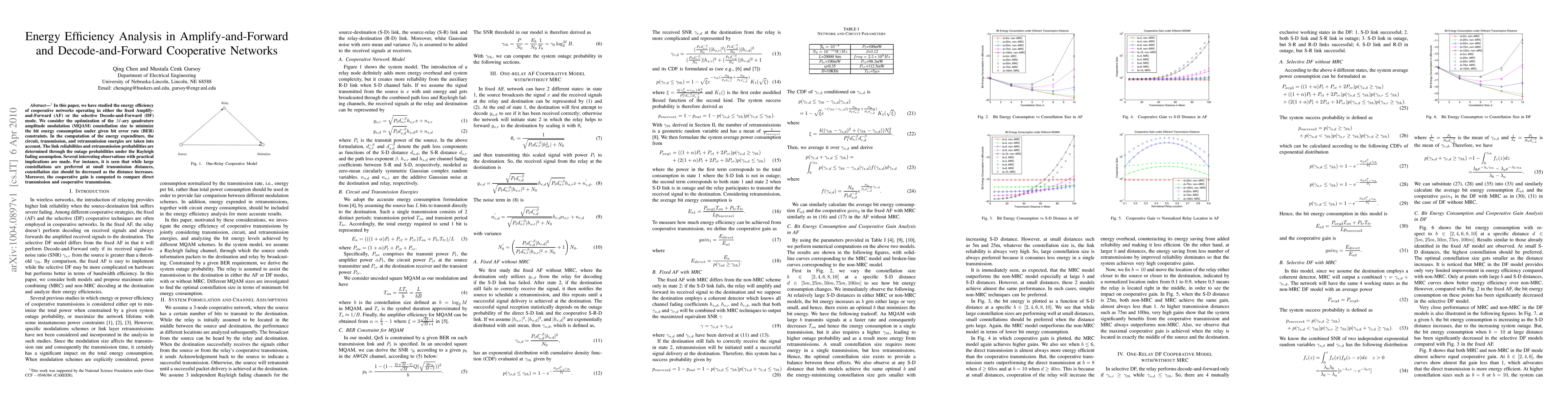 This paper analyzes the energy efficiency of cooperative networks using either Amplify-and-Forward or Decode-and-Forward modes, optimizing M-ary quadrature amplitude modulation constellation size to minimize bit energy consumption under BER constraints. It finds that larger constellations are better for short distances, while smaller constellations are more efficient for longer distances.