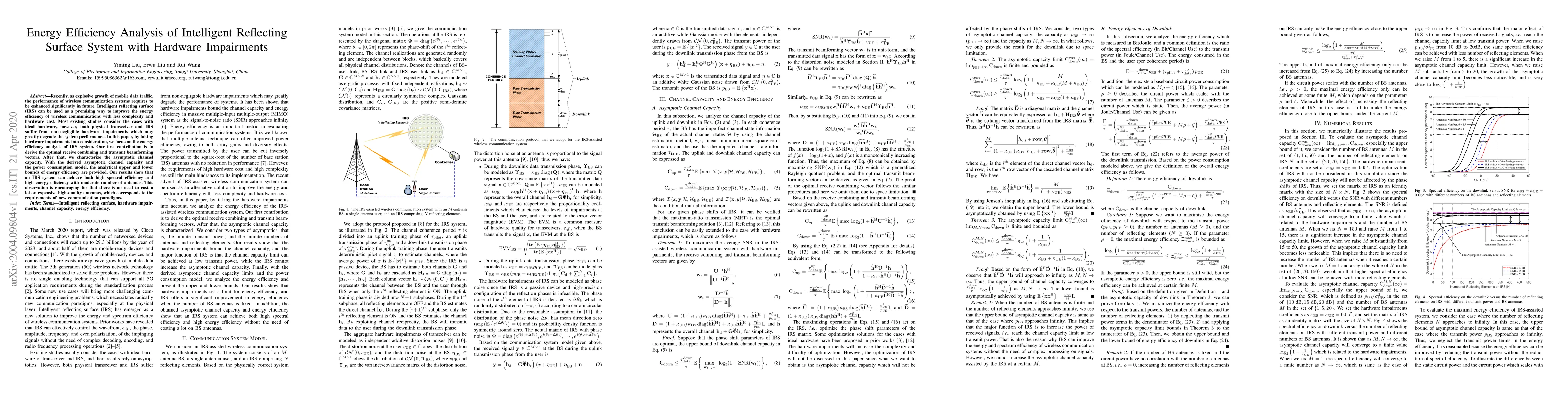 This paper analyzes the energy efficiency of intelligent reflecting surface (IRS) systems considering hardware impairments. It derives optimal combining and beamforming vectors, characterizes asymptotic channel capacity, and provides analytical bounds for energy efficiency, demonstrating that IRS can achieve high efficiency with moderate antenna counts, reducing the need for expensive hardware.