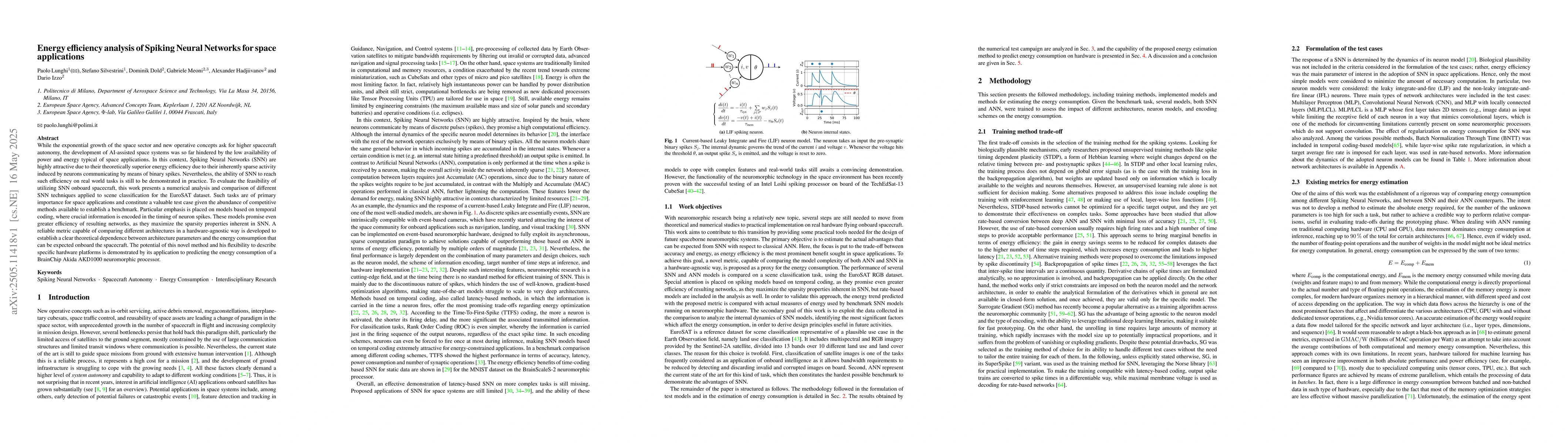 The research presents a numerical analysis and comparison of different Spiking Neural Networks (SNN) techniques applied to scene classification for the EuroSAT dataset, focusing on models based on temporal coding. A hardware-agnostic metric is developed to predict energy consumption onboard spacecraft.