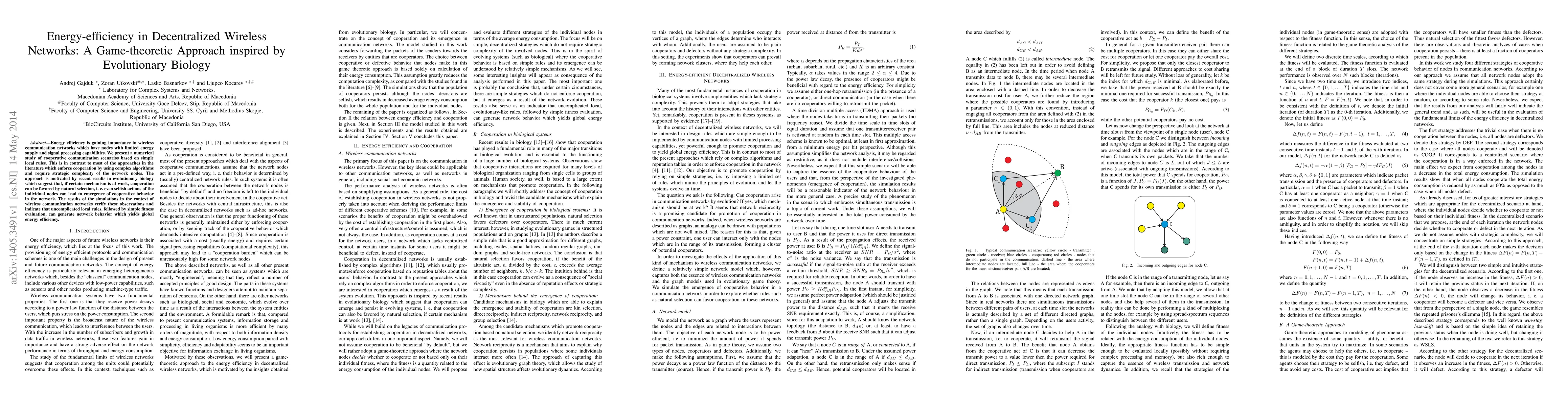 This paper explores energy efficiency in decentralized wireless networks using a game-theoretic approach inspired by evolutionary biology. It demonstrates that simple local rules can lead to cooperative behavior and global energy efficiency without requiring complex algorithms, echoing findings from evolutionary biology where cooperation emerges through natural selection.