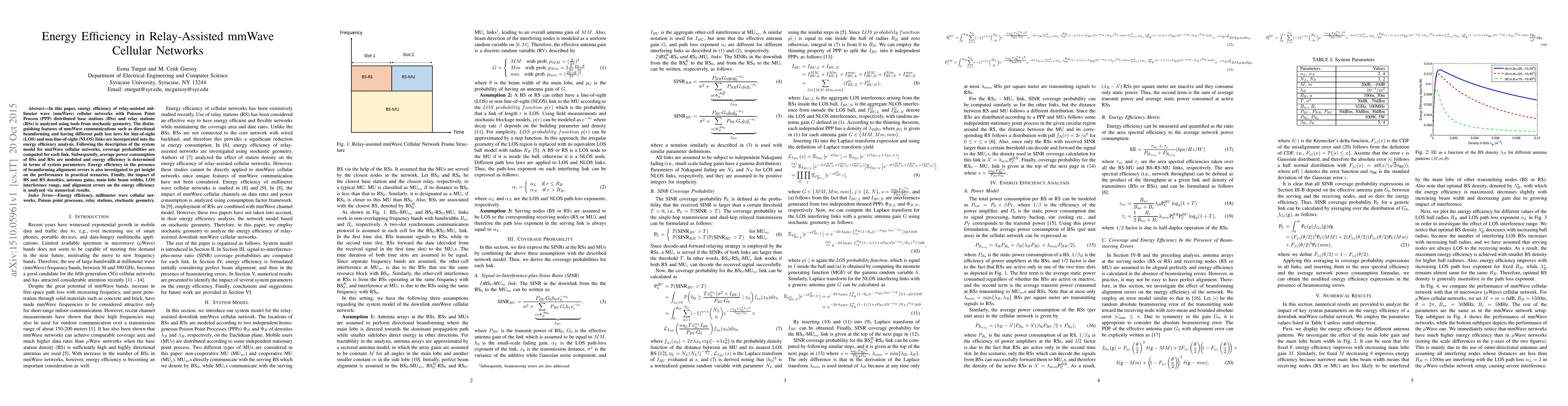 This paper analyzes the energy efficiency of relay-assisted mmWave cellular networks using stochastic geometry, incorporating directional beamforming and different path loss laws for LOS and NLOS links. Numerical results explore the impact of various system parameters on energy efficiency, including beamforming alignment errors.