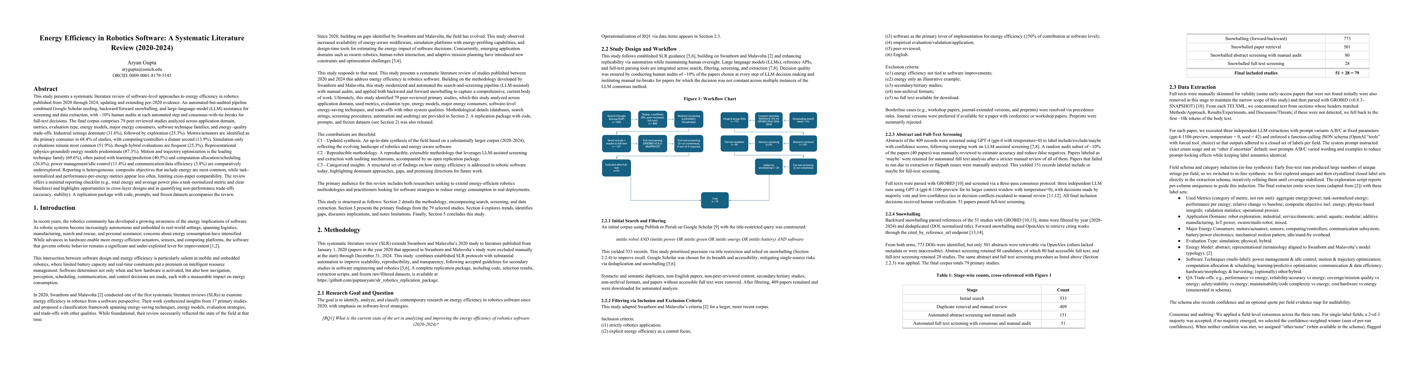 This study presents a systematic literature review of software-level approaches to energy efficiency in robotics published from 2020 through 2024, updating and extending pre-2020 evidence. An automated-but-audited pipeline combined Google Scholar seeding, backward/forward snowballing, and large-language-model (LLM) assistance for screening and data extraction, with ~10% human audits at each automated step and consensus-with-tie-breaks for full-text decisions. The final corpus comprises 79 peer-reviewed studies analyzed across application domain, metrics, evaluation type, energy models, major energy consumers, software technique families, and energy-quality trade-offs. Industrial settings dominate (31.6%) followed by exploration (25.3%). Motors/actuators are identified as the primary consumer in 68.4% of studies, with computing/controllers a distant second (13.9%). Simulation-only evaluations remain most common (51.9%), though hybrid evaluations are frequent (25.3%). Representational (physics-grounded) energy models predominate (87.3%). Motion and trajectory optimization is the leading technique family (69.6%), often paired with learning/prediction (40.5%) and computation allocation/scheduling (26.6%); power management/idle control (11.4%) and communication/data efficiency (3.8%) are comparatively underexplored. Reporting is heterogeneous: composite objectives that include energy are most common, while task-normalized and performance-per-energy metrics appear less often, limiting cross-paper comparability. The review offers a minimal reporting checklist (e.g., total energy and average power plus a task-normalized metric and clear baselines) and highlights opportunities in cross-layer designs and in quantifying non-performance trade-offs (accuracy, stability). A replication package with code, prompts, and frozen datasets accompanies the review.