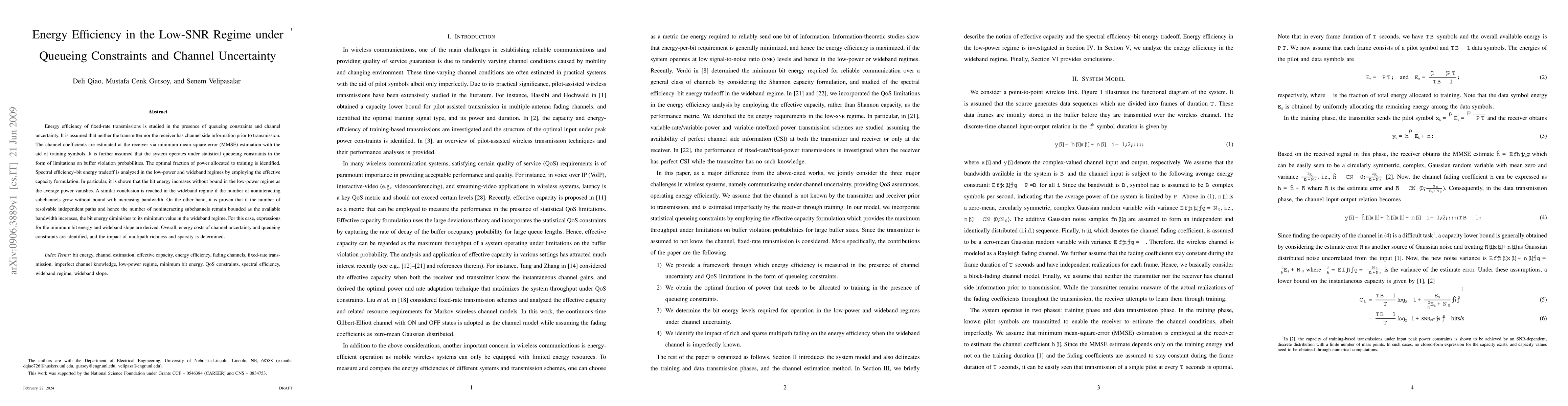 This paper investigates energy efficiency in fixed-rate transmissions under queueing constraints and channel uncertainty, focusing on the low-SNR regime. It identifies the optimal power allocation for training symbols and analyzes spectral efficiency-bit energy tradeoffs, showing that bit energy increases without bound in low-power and wideband scenarios unless the number of independent subchannels remains bounded.