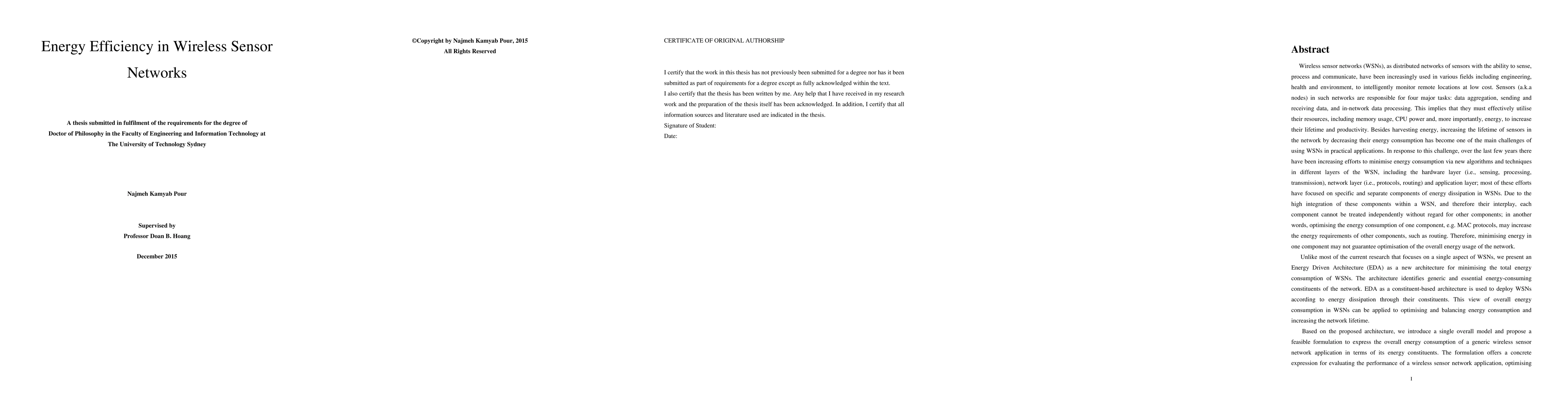 Unlike most of the current research that focuses on a single aspect of WSNs, we present an Energy Driven Architecture (EDA) as a new architecture for minimising the total energy consumption of WSNs. EDA as a constituent-based architecture is used to deploy WSNs according to energy dissipation through their constituents. This view of overall energy consumption in WSNs can be applied to optimising and balancing energy consumption and increasing the network lifetime. Refer back to the architecture, we introduce a single overall model and propose a feasible formulation to express the overall energy consumption of a generic wireless sensor network application in terms of its energy constituents. The formulation offers a concrete expression for evaluating the performance of WSN application, optimising its constituents operations, and designing more energy-efficient applications. The ultimate aim is to produce an energy map architecture of a generic WSN application that comprises essential and definable energy constituents and the relationships between these constituents to explore strategies for minimising the overall energy consumption of the application. Later, parameters affecting energy in WSNs are extracted. The dependency between these parameters and the average energy consumption of an application is then investigated. A few statistical tools are applied for parameter reduction followed by random forest regression to model energy consumption per delivered packet with and without parameter reduction to determine the reduction in accuracy due to reduction. Finally, an energy-efficient dynamic topology management algorithm is proposed based on the EDA model and the prevalent parameters. The performance of the new topology management algorithm, which employs Dijkstra to find energy-efficient lowest cost paths among nodes, is compared to similar topology management algorithms.