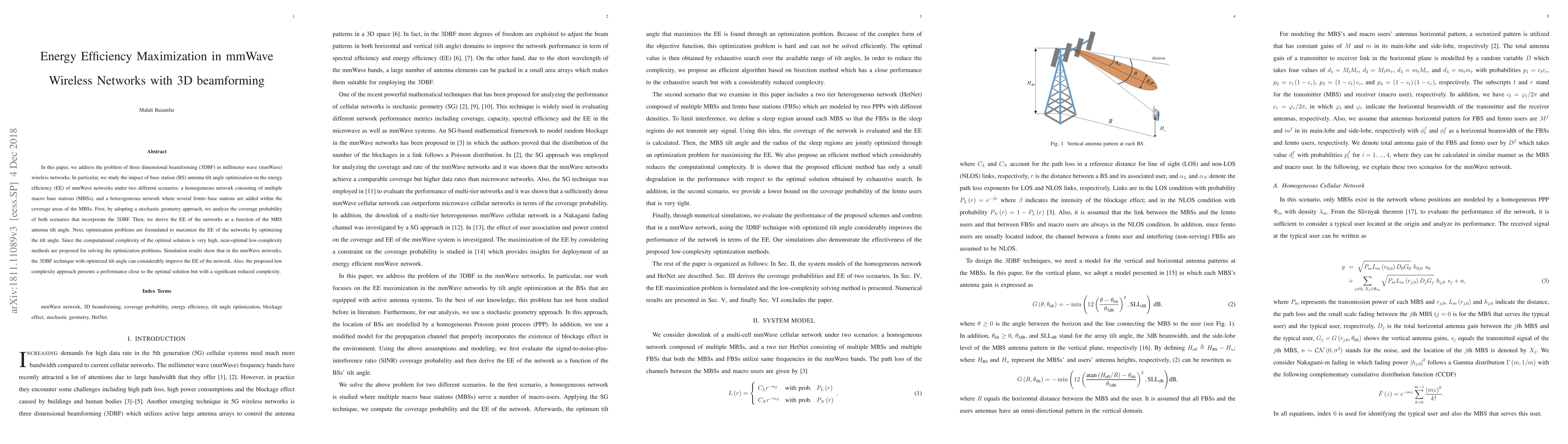 This paper investigates the optimization of antenna tilt angle in millimeter wave (mmWave) wireless networks using 3D beamforming to maximize energy efficiency. It formulates optimization problems to enhance energy efficiency in both homogeneous and heterogeneous networks, and proposes low-complexity methods for near-optimal solutions, demonstrating significant EE improvements.