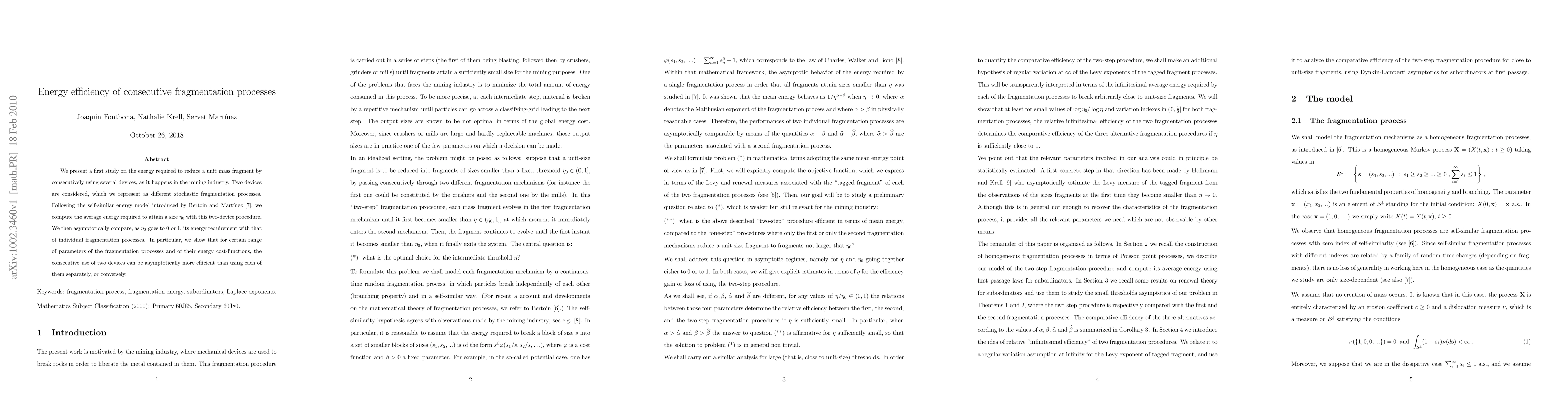 We present a first study on the energy required to reduce a unit mass fragment by consecutively using several devices, as it happens in the mining industry. Two devices are considered, which we represent as different stochastic fragmentation processes. Following the self-similar energy model introduced by Bertoin and Martinez, we compute the average energy required to attain a size x with this two-device procedure. We then asymptotically compare, as x goes to 0 or 1, its energy requirement with that of individual fragmentation processes. In particular, we show that for certain range of parameters of the fragmentation processes and of their energy cost-functions, the consecutive use of two devices can be asymptotically more efficient than using each of them separately, or conversely.