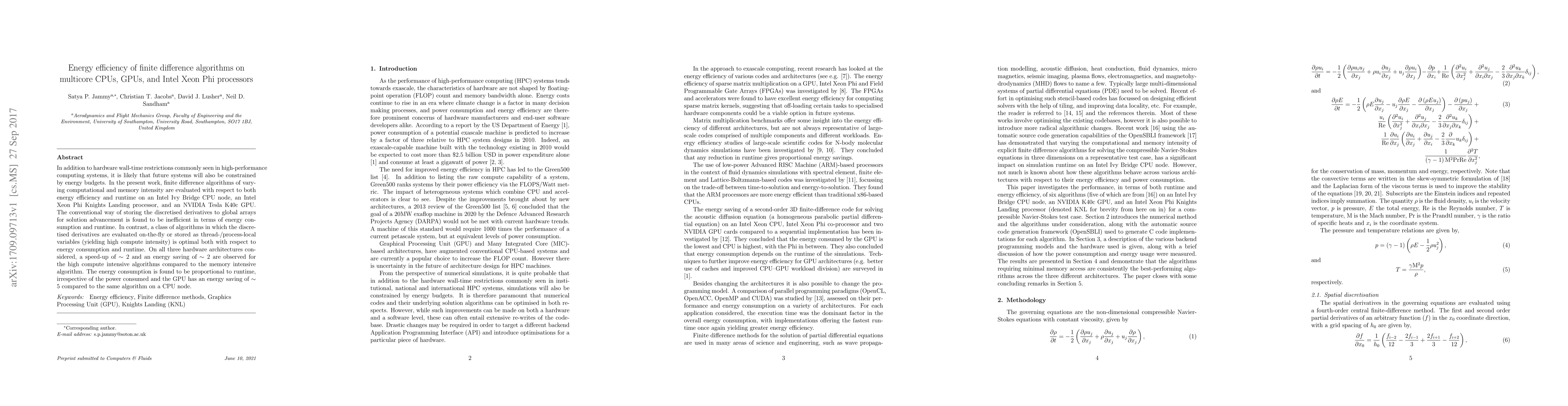 Researchers evaluated energy efficiency of finite difference algorithms on CPUs, GPUs, and Intel Xeon Phi processors, finding that high-compute algorithms outperform memory-intensive ones with a ~2 speed-up and 2x energy saving.