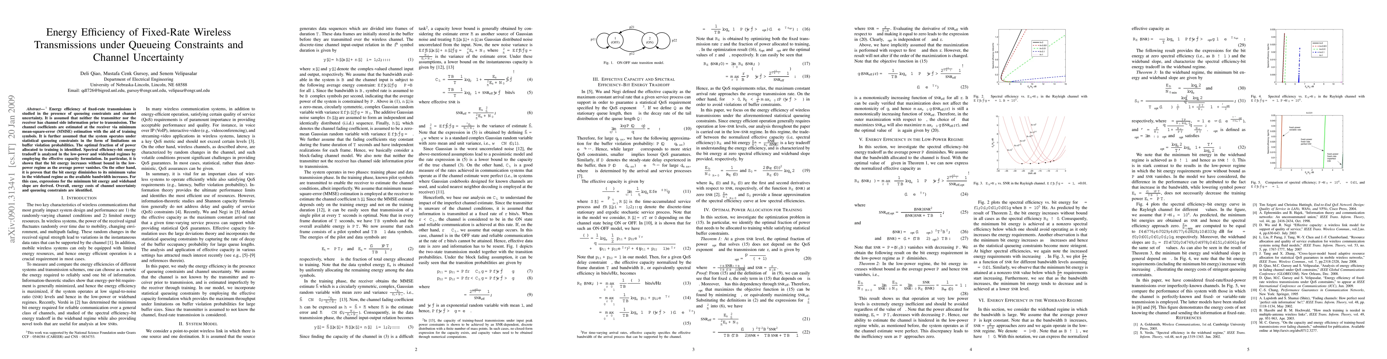 This paper investigates the energy efficiency of fixed-rate wireless transmissions under queueing constraints and channel uncertainty, deriving optimal power allocation for training symbols. It finds that bit energy increases indefinitely in low-power scenarios and diminishes to a minimum in wideband conditions, highlighting the impact of channel uncertainty and queueing constraints on energy costs.
