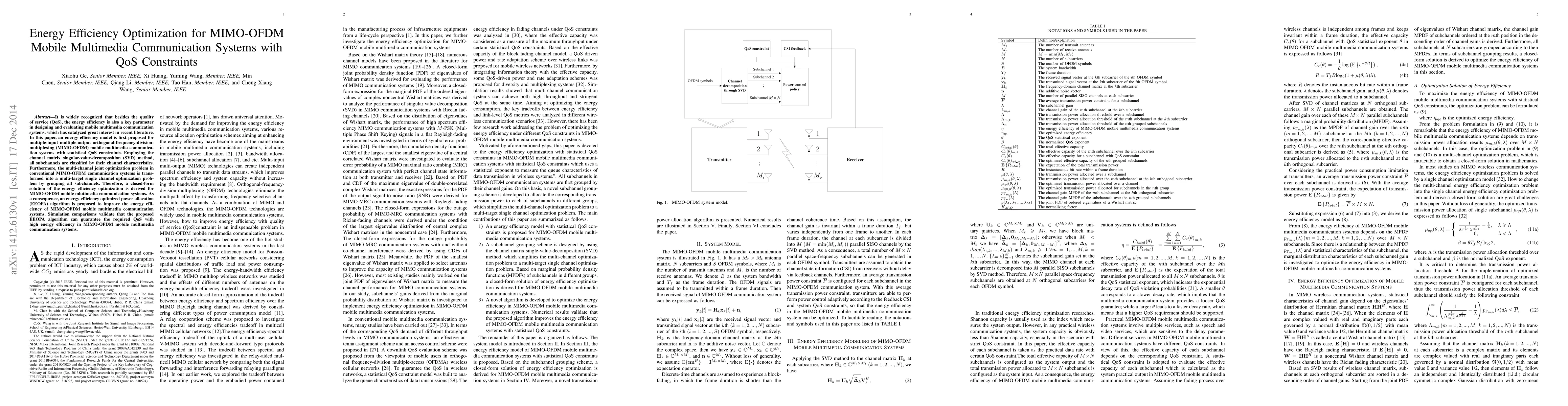 This paper proposes an energy efficiency optimization model for MIMO-OFDM mobile multimedia communication systems under QoS constraints, transforming the multi-channel optimization problem into a single-channel one. An EEOPA algorithm is developed to achieve high energy efficiency while maintaining required QoS, validated by simulations.