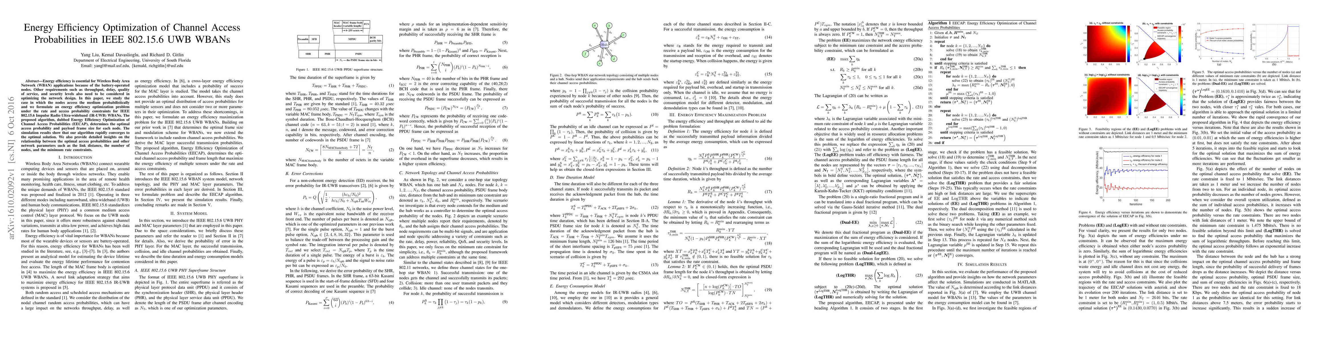 This paper proposes an algorithm called EECAP to optimize energy efficiency in IEEE 802.15.6 UWB WBANs by determining optimal channel access probabilities and payload frame sizes, achieving rapid convergence to the optimal solution while considering throughput, delay, and quality of service.
