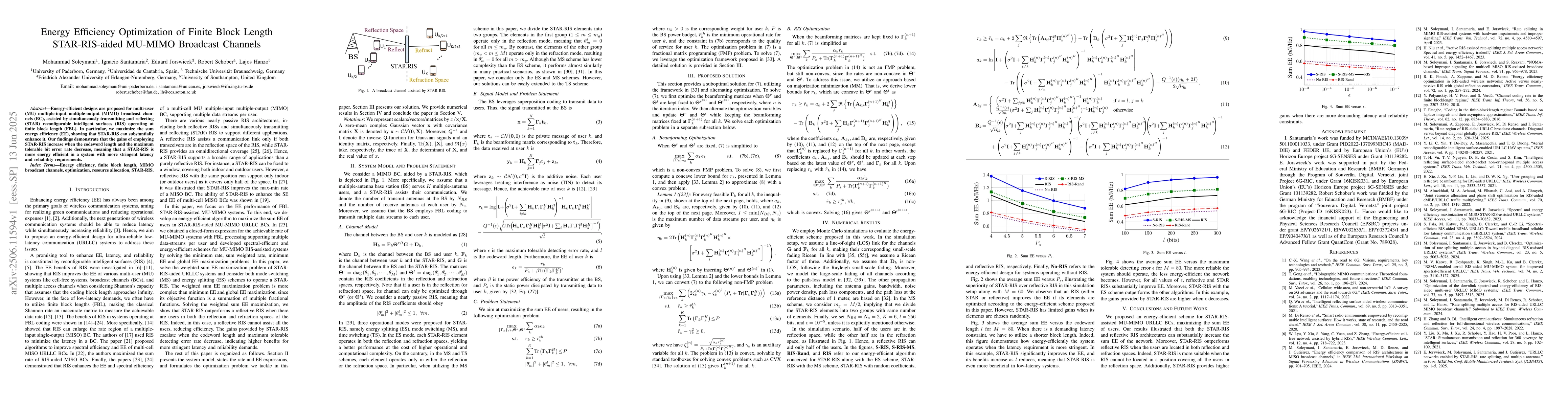 Energy-efficient designs are proposed for multi-user (MU) multiple-input multiple-output (MIMO) broadcast channels (BC), assisted by simultaneously transmitting and reflecting (STAR) reconfigurable intelligent surfaces (RIS) operating at finite block length (FBL). In particular, we maximize the sum energy efficiency (EE), showing that STAR-RIS can substantially enhance it. Our findings demonstrate that the gains of employing STAR-RIS increase when the codeword length and the maximum tolerable bit error rate decrease, meaning that a STAR-RIS is more energy efficient in a system with more stringent latency and reliability requirements.