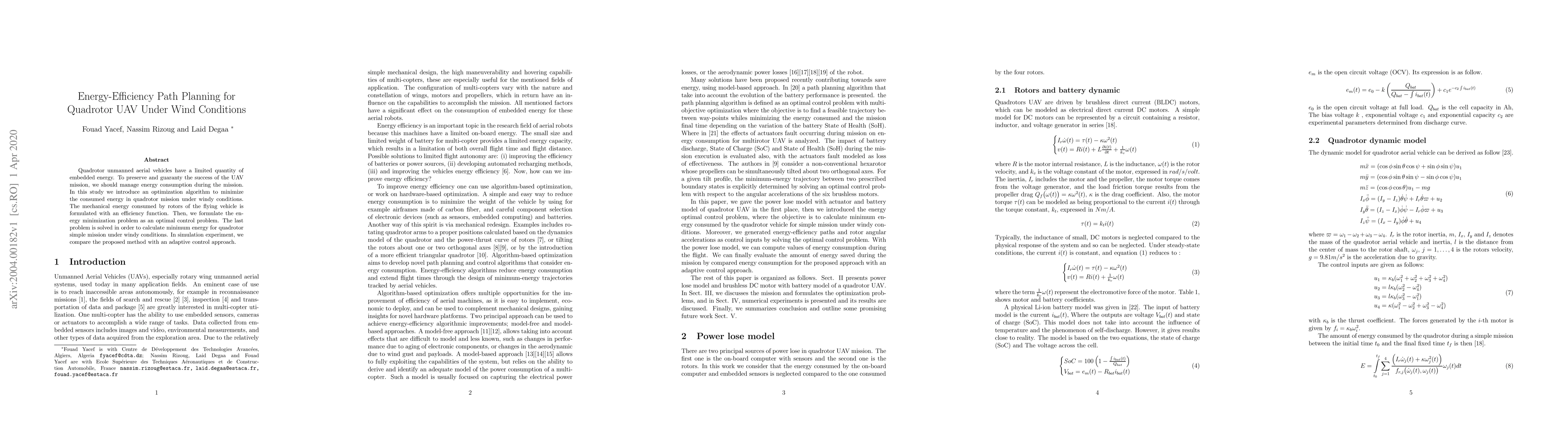 Quadrotor unmanned aerial vehicles have a limited quantity of embedded energy. To preserve and guaranty the success of the UAV mission, we should manage energy consumption during the mission. In this study we introduce an optimization algorithm to minimize the consumed energy in quadrotor mission under windy conditions. The mechanical energy consumed by rotors of the flying vehicle is formulated with an efficiency function. Then, we formulate the energy minimization problem as an optimal control problem. The last problem is solved in order to calculate minimum energy for quadrotor simple mission under windy conditions. In simulation experiment, we compare the proposed method with an adaptive control approach.