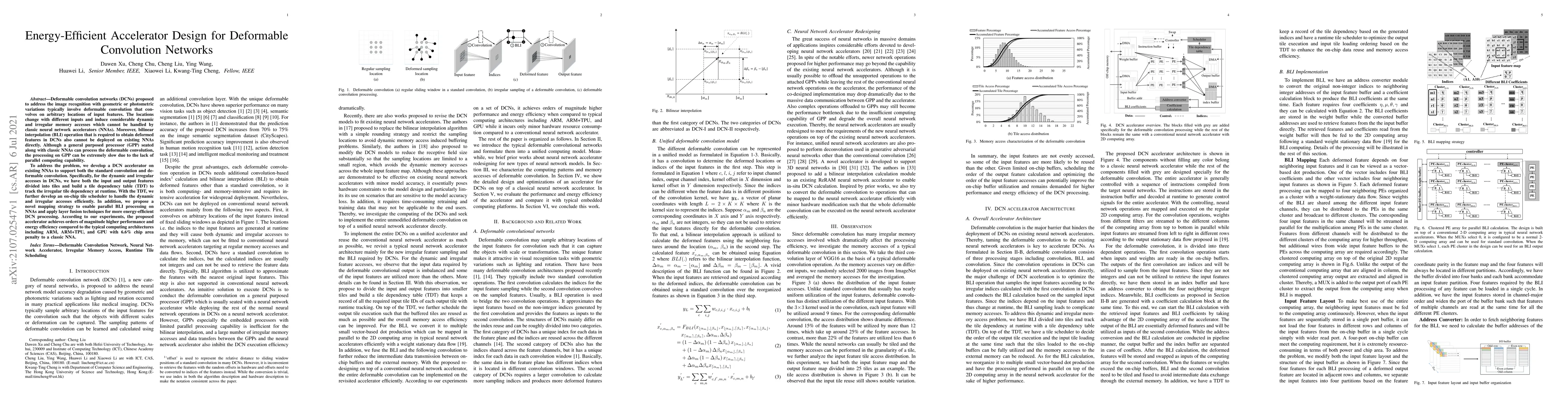 This paper proposes an energy-efficient accelerator design for deformable convolution networks (DCNs) that addresses the challenges of dynamic and irregular memory accesses. The developed accelerator supports both standard and deformable convolutions using a tile dependency table and an on-chip tile scheduler, along with a novel mapping strategy for parallel bilinear interpolation processing, achieving significantly higher performance and energy efficiency compared to traditional architectures.