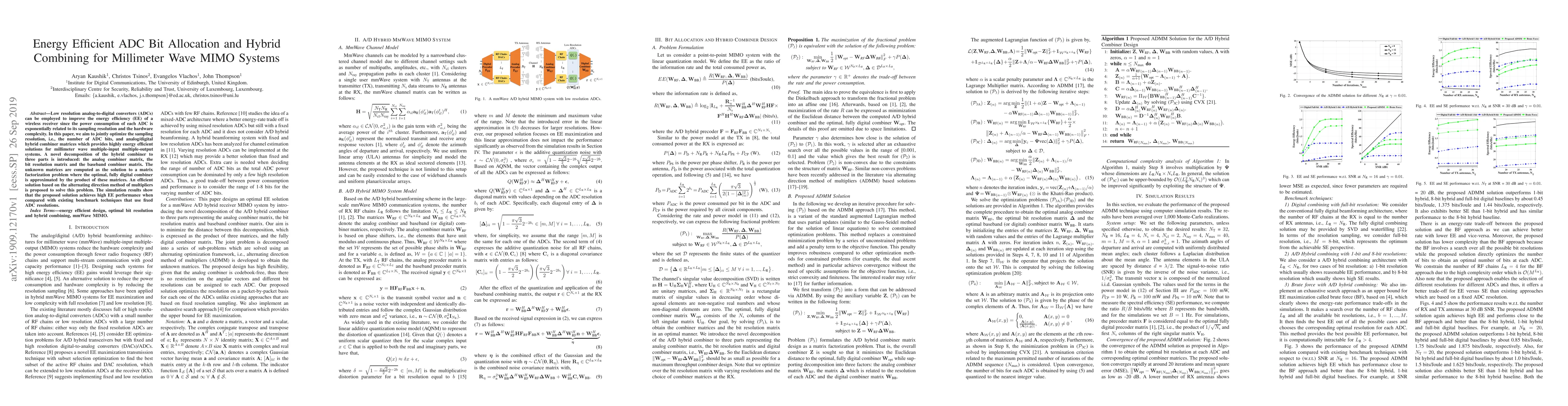 This paper proposes an energy efficient method for millimeter wave MIMO systems by optimizing the sampling resolution of ADCs and hybrid combiner matrices. It introduces a novel decomposition of the hybrid combiner and uses an alternating direction method to solve the matrix factorization problem, achieving superior energy efficiency compared to fixed ADC resolutions.