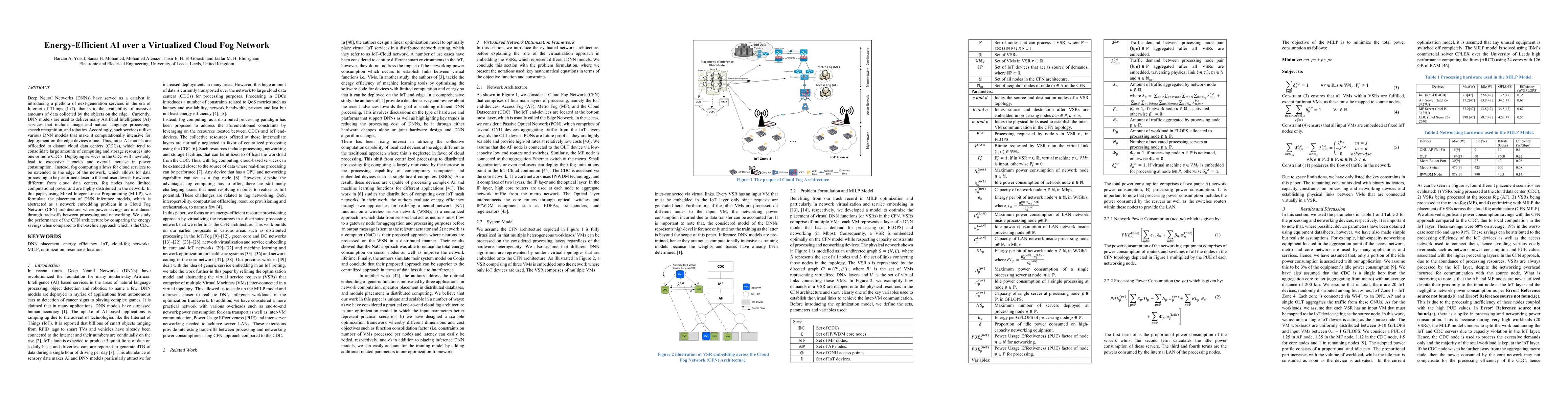 Deep Neural Networks (DNNs) have served as a catalyst in introducing a plethora of next-generation services in the era of Internet of Things (IoT), thanks to the availability of massive amounts of data collected by the objects on the edge. Currently, DNN models are used to deliver many Artificial Intelligence (AI) services that include image and natural language processing, speech recognition, and robotics. Accordingly, such services utilize various DNN models that make it computationally intensive for deployment on the edge devices alone. Thus, most AI models are offloaded to distant cloud data centers (CDCs), which tend to consolidate large amounts of computing and storage resources into one or more CDCs. Deploying services in the CDC will inevitably lead to excessive latencies and overall increase in power consumption. Instead, fog computing allows for cloud services to be extended to the edge of the network, which allows for data processing to be performed closer to the end-user device. However, different from cloud data centers, fog nodes have limited computational power and are highly distributed in the network. In this paper, using Mixed Integer Linear Programming (MILP), we formulate the placement of DNN inference models, which is abstracted as a network embedding problem in a Cloud Fog Network (CFN) architecture, where power savings are introduced through trade-offs between processing and networking. We study the performance of the CFN architecture by comparing the energy savings when compared to the baseline approach which is the CDC.
