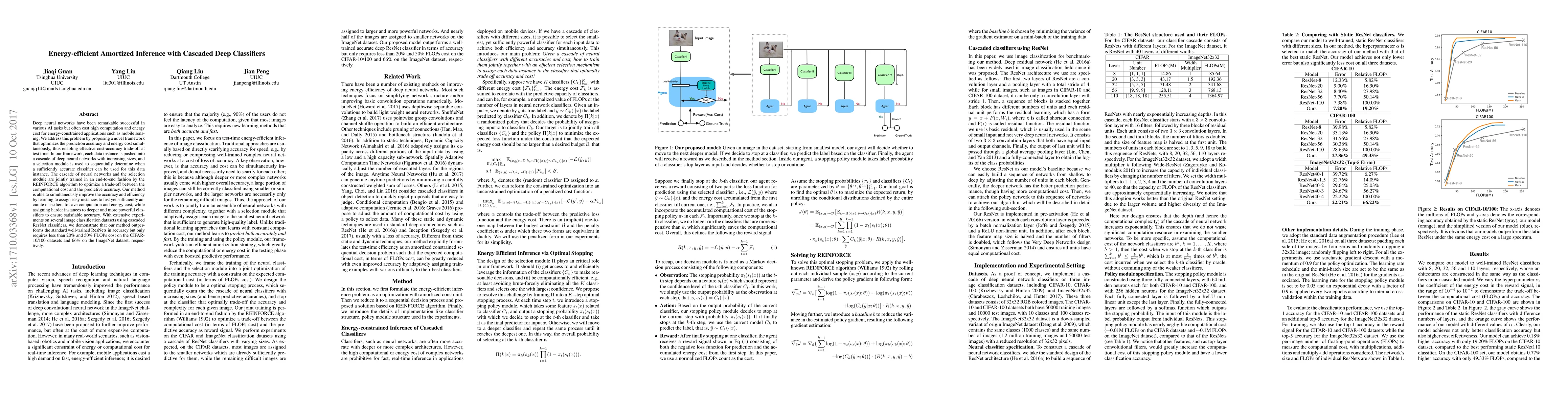 Deep neural networks have been remarkable successful in various AI tasks but often cast high computation and energy cost for energy-constrained applications such as mobile sensing. We address this problem by proposing a novel framework that optimizes the prediction accuracy and energy cost simultaneously, thus enabling effective cost-accuracy trade-off at test time. In our framework, each data instance is pushed into a cascade of deep neural networks with increasing sizes, and a selection module is used to sequentially determine when a sufficiently accurate classifier can be used for this data instance. The cascade of neural networks and the selection module are jointly trained in an end-to-end fashion by the REINFORCE algorithm to optimize a trade-off between the computational cost and the predictive accuracy. Our method is able to simultaneously improve the accuracy and efficiency by learning to assign easy instances to fast yet sufficiently accurate classifiers to save computation and energy cost, while assigning harder instances to deeper and more powerful classifiers to ensure satisfiable accuracy. With extensive experiments on several image classification datasets using cascaded ResNet classifiers, we demonstrate that our method outperforms the standard well-trained ResNets in accuracy but only requires less than 20% and 50% FLOPs cost on the CIFAR-10/100 datasets and 66% on the ImageNet dataset, respectively.