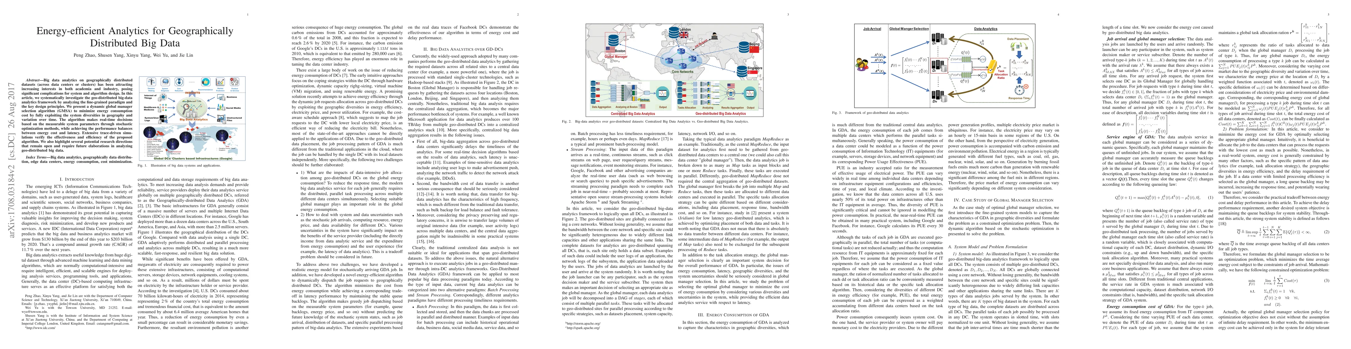 Big data analytics on geographically distributed datasets (across data centers or clusters) has been attracting increasing interests from both academia and industry, but also significantly complicates the system and algorithm designs. In this article, we systematically investigate the geo-distributed big-data analytics framework by analyzing the fine-grained paradigm and the key design principles. We present a dynamic global manager selection algorithm (GMSA) to minimize energy consumption cost by fully exploiting the system diversities in geography and variation over time. The algorithm makes real-time decisions based on the measurable system parameters through stochastic optimization methods, while achieving the performance balances between energy cost and latency. Extensive trace-driven simulations verify the effectiveness and efficiency of the proposed algorithm. We also highlight several potential research directions that remain open and require future elaborations in analyzing geo-distributed big data.