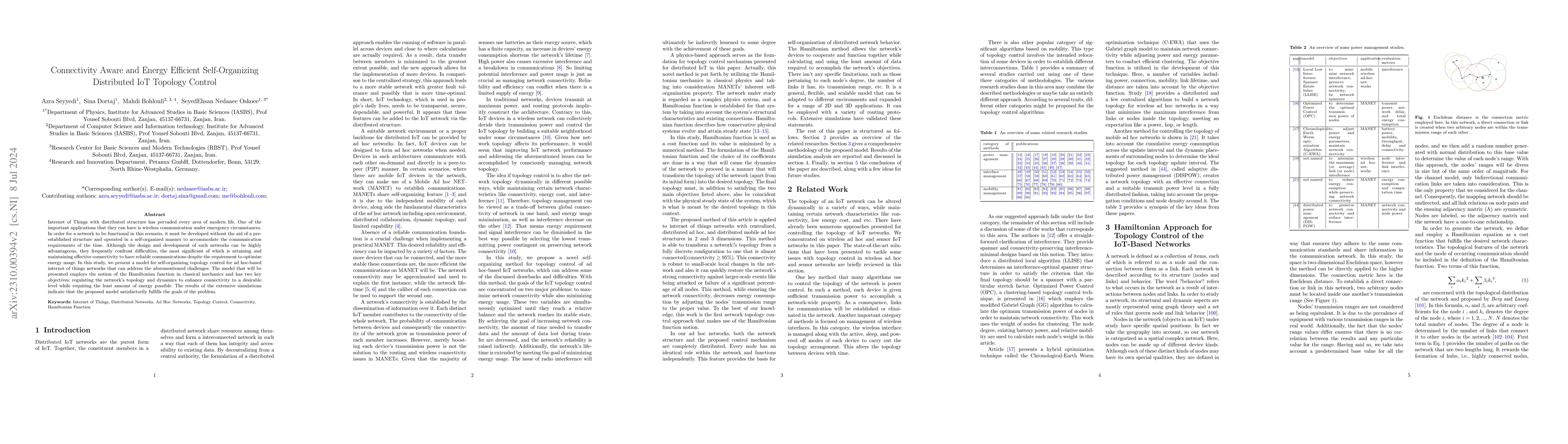 This paper proposes a self-organizing topology control model for distributed IoT networks, utilizing the Hamiltonian function to optimize connectivity and minimize energy usage. Simulation results demonstrate the model's effectiveness in achieving the desired balance between connectivity and energy efficiency.