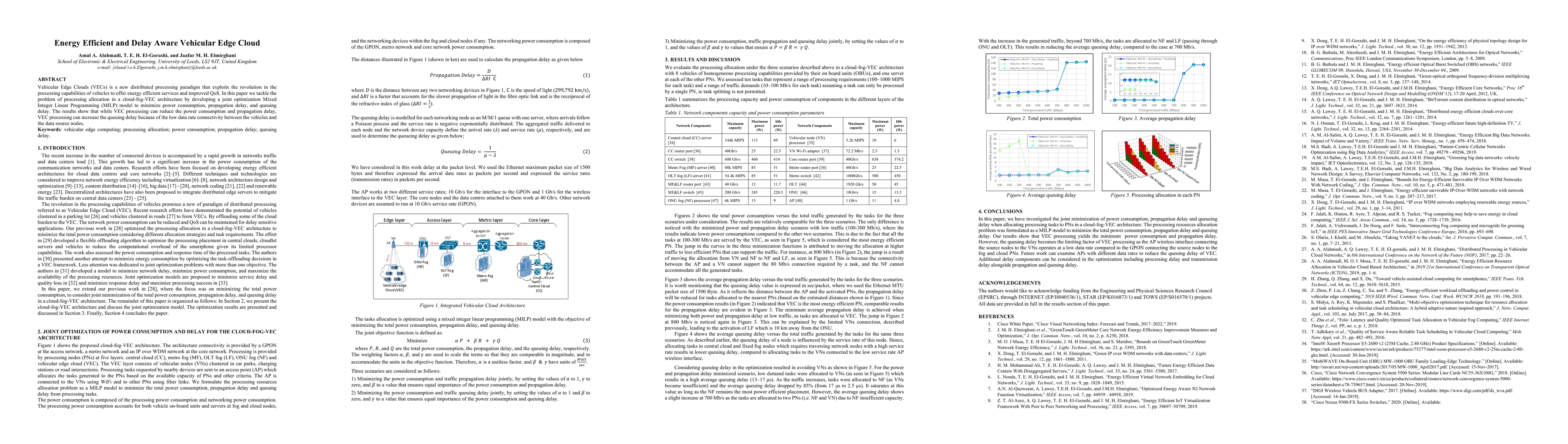 This paper develops a Mixed Integer Linear Programming model to optimize processing allocation in a cloud-fog-VEC architecture, aiming to minimize power consumption, propagation delay, and queuing delay. While VEC processing can reduce power and propagation delays, it may increase queuing delay due to low connectivity data rates.