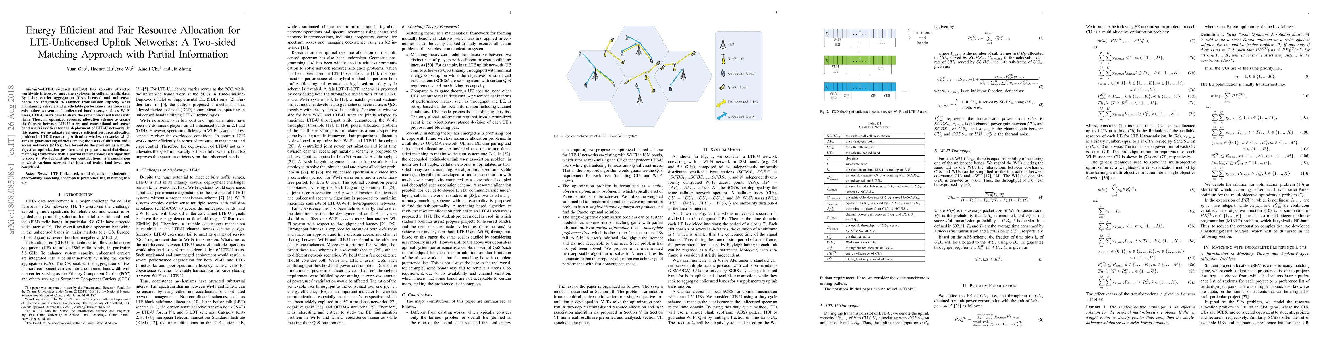 This paper proposes an energy-efficient and fair resource allocation scheme for LTE-Unlicensed (LTE-U) networks using a two-sided matching approach with partial information, aiming to optimize coexistence with other wireless networks and ensure equitable user treatment across different radio access networks. Simulation results demonstrate the effectiveness of the proposed semi-distributed matching framework under varying network conditions.