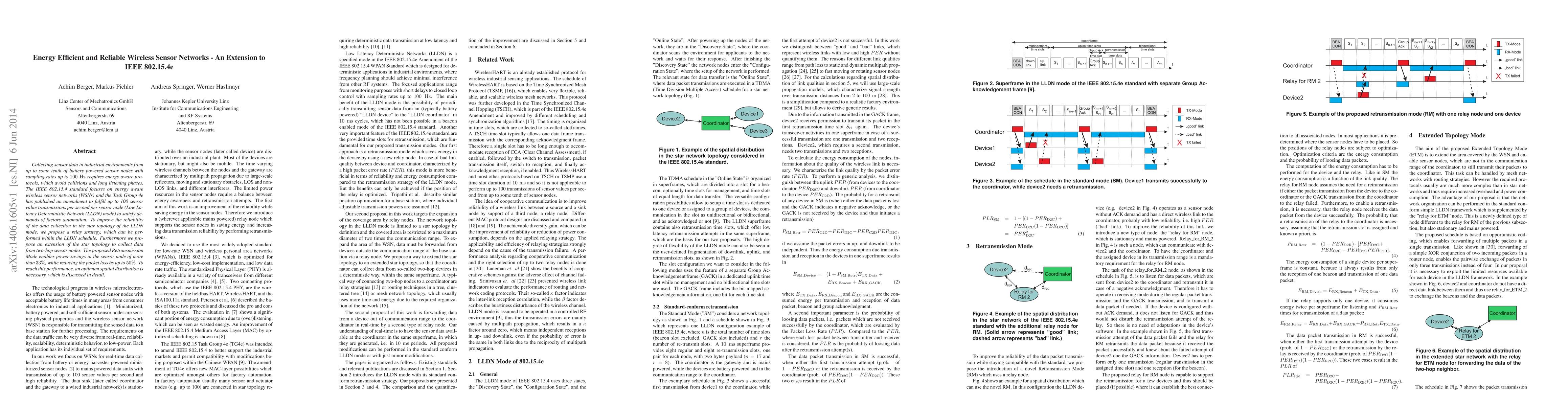 Collecting sensor data in industrial environments from up to some tenth of battery powered sensor nodes with sampling rates up to 100Hz requires energy aware protocols, which avoid collisions and long listening phases. The IEEE 802.15.4 standard focuses on energy aware wireless sensor networks (WSNs) and the Task Group 4e has published an amendment to fulfill up to 100 sensor value transmissions per second per sensor node (Low Latency Deterministic Network (LLDN) mode) to satisfy demands of factory automation. To improve the reliability of the data collection in the star topology of the LLDN mode, we propose a relay strategy, which can be performed within the LLDN schedule. Furthermore we propose an extension of the star topology to collect data from two-hop sensor nodes. The proposed Retransmission Mode enables power savings in the sensor node of more than 33%, while reducing the packet loss by up to 50%. To reach this performance, an optimum spatial distribution is necessary, which is discussed in detail.