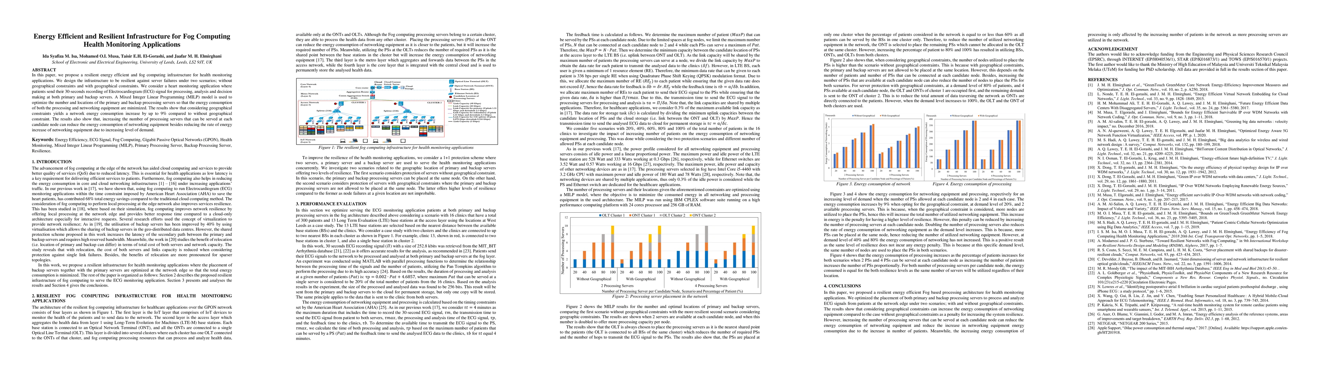 This paper proposes an energy-efficient and resilient fog computing infrastructure for health monitoring applications, optimizing server placement using a MILP model to minimize energy consumption. Results indicate geographical constraints increase energy consumption by up to 9%, while more processing servers reduce networking energy costs and demand-related increases.
