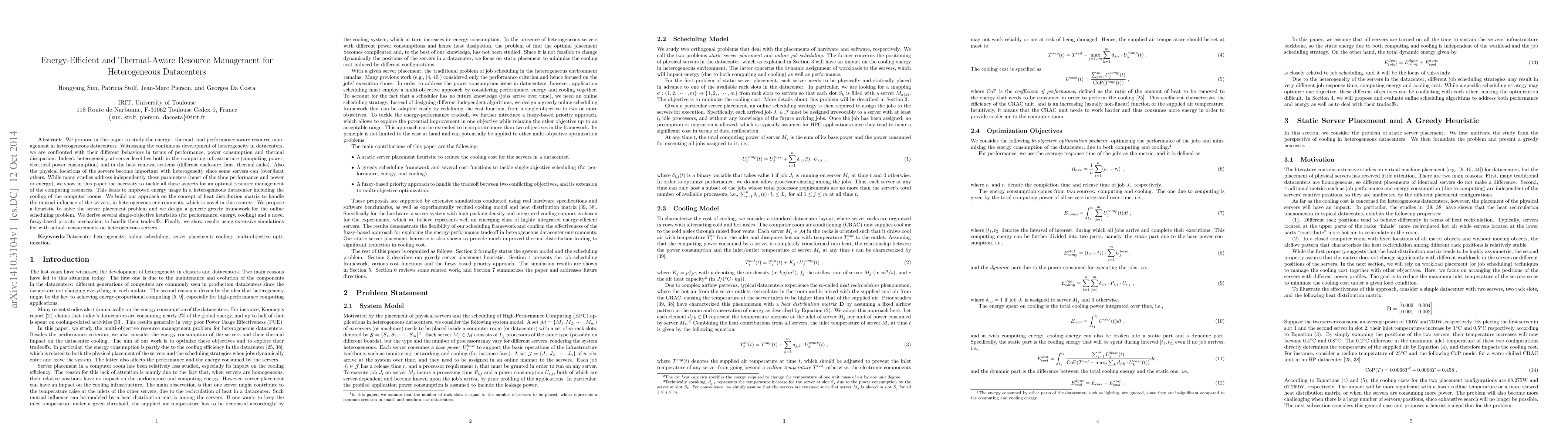 This paper proposes an integrated approach for managing resources in heterogeneous datacenters by considering energy efficiency, thermal awareness, and performance. It introduces a novel heat distribution matrix and heuristics for server placement and scheduling to optimize energy usage while mitigating thermal issues. The method is validated through extensive simulations using real server data.
