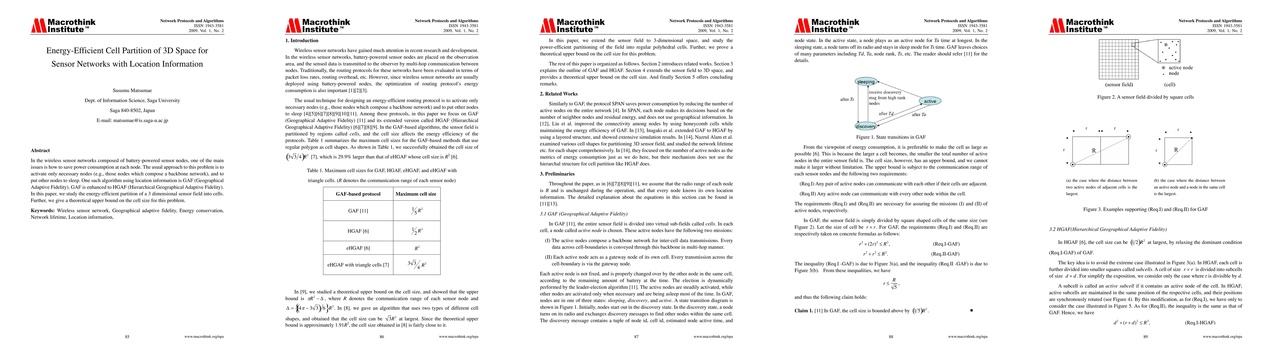 In the wireless sensor networks composed of battery-powered sensor nodes, one of the main issues is how to save power consumption on each node. The usual approach to this problem is to activate only necessary nodes (e.g., those nodes which compose a backbone network), and to put other nodes to sleep. One such algorithm using location information is GAF (Geographical Adaptive Fidelity), and GAF is enhanced to HGAF (Hierarchical Geographical Adaptive Fidelity). In this paper, we study the energy-efficient partition of a 3 dimensional sensor field into cells. Further, we give a theoretical upper bound on cell size for this problem.