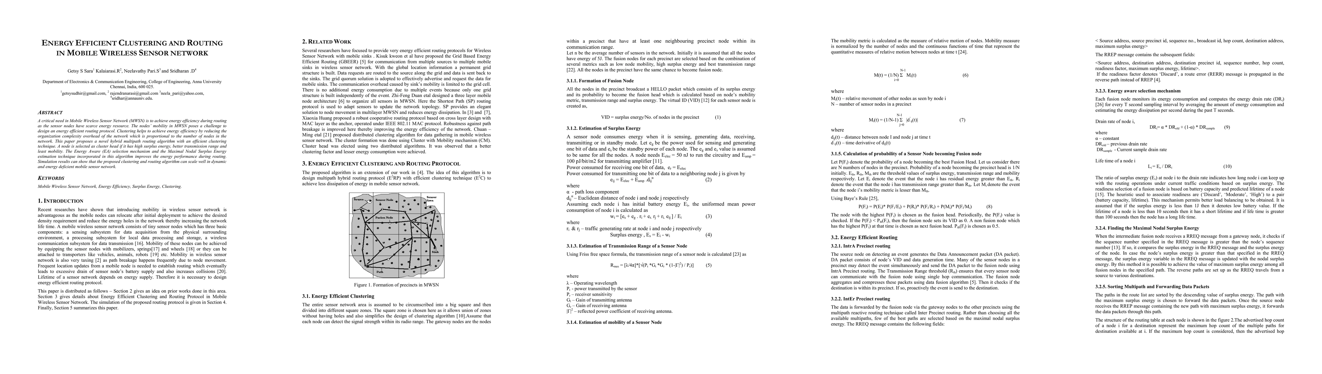 This paper proposes a hybrid multipath routing algorithm with an efficient clustering technique to enhance energy efficiency in Mobile Wireless Sensor Networks. The algorithm selects cluster heads based on surplus energy, transmission range, and mobility, improving routing performance and scalability in dynamic environments.