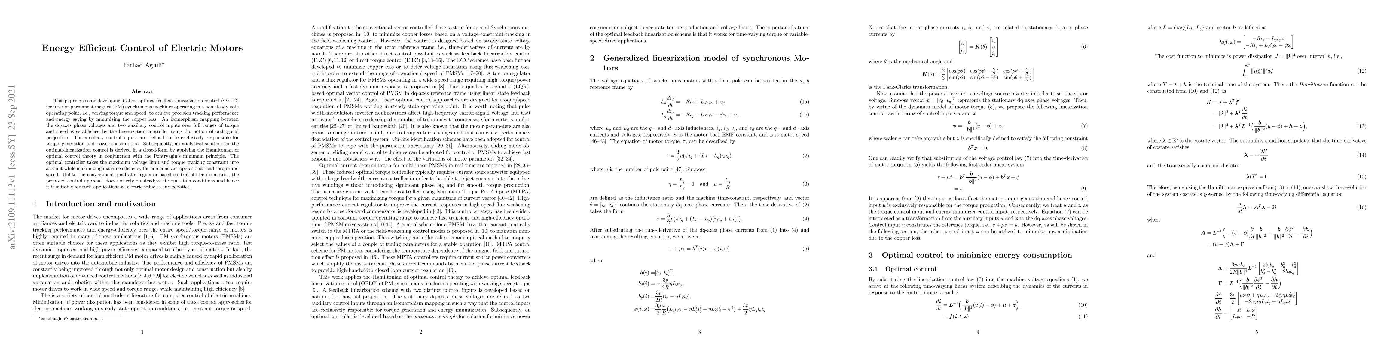 This paper presents development of an optimal feedback linearization control (OFLC) for interior permanent magnet (PM) synchronous machines operating in a non steady-sate operating point, i.e., varying torque and speed, to achieve precision tracking performance and energy saving by minimizing the copper loss. An isomorphism mapping between the dq-axes phase voltages and two auxiliary control inputs over full ranges of torque and speed is established by the linearization controller using the notion of orthogonal projection. The auxiliary control inputs are defined to be exclusively responsible for torque generation and power consumption. Subsequently, an analytical solution for the optimal-linearization control is derived in a closed-form by applying the Hamiltonian of optimal control theory in conjunction with the Pontryagin's minimum principle. The optimal controller takes the maximum voltage limit and torque tracking constraint into account while maximizing machine efficiency for non-constant operational load torque and speed. Unlike the convectional quadratic regulator-based control of electric motors, the proposed control approach does not rely on steady-state operation conditions and hence it is suitable for such applications as electric vehicles and robotics.