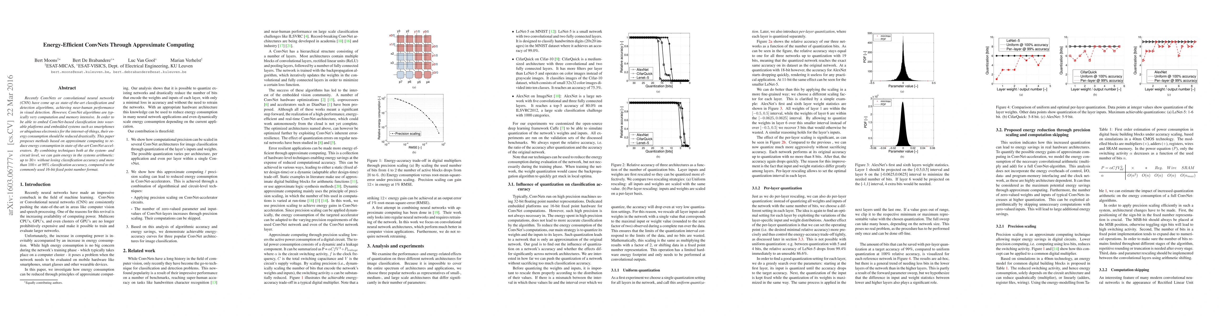 Recently ConvNets or convolutional neural networks (CNN) have come up as state-of-the-art classification and detection algorithms, achieving near-human performance in visual detection. However, ConvNet algorithms are typically very computation and memory intensive. In order to be able to embed ConvNet-based classification into wearable platforms and embedded systems such as smartphones or ubiquitous electronics for the internet-of-things, their energy consumption should be reduced drastically. This paper proposes methods based on approximate computing to reduce energy consumption in state-of-the-art ConvNet accelerators. By combining techniques both at the system- and circuit level, we can gain energy in the systems arithmetic: up to 30x without losing classification accuracy and more than 100x at 99% classification accuracy, compared to the commonly used 16-bit fixed point number format.
