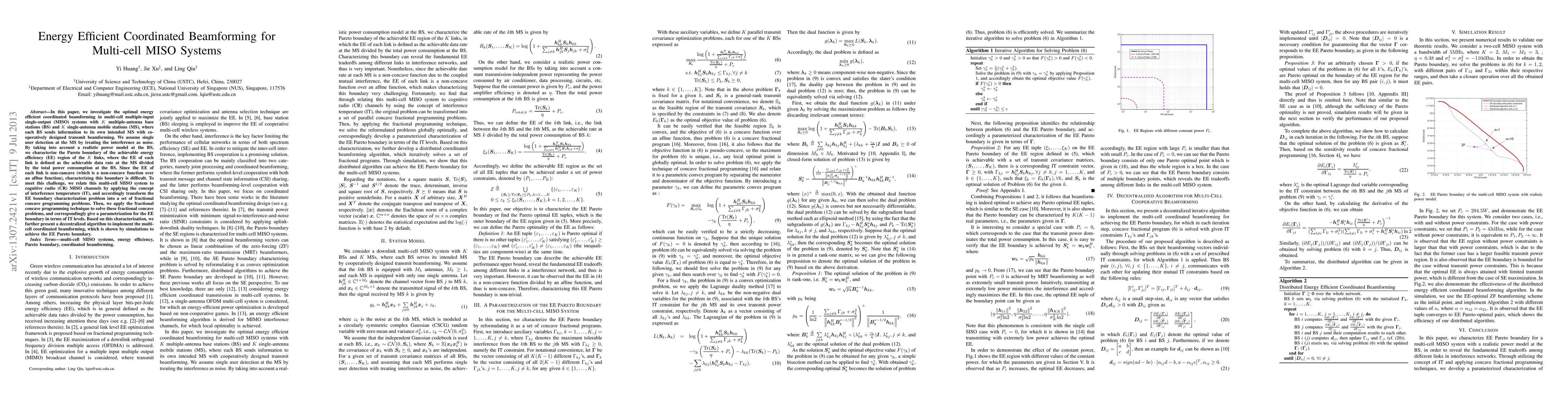 This paper explores optimal energy efficient coordinated beamforming in multi-cell MISO systems, transforming the non-concave energy efficiency boundary problem into fractional concave programming via cognitive radio concepts. A decentralized algorithm is proposed to achieve the Pareto boundary of energy efficiency.