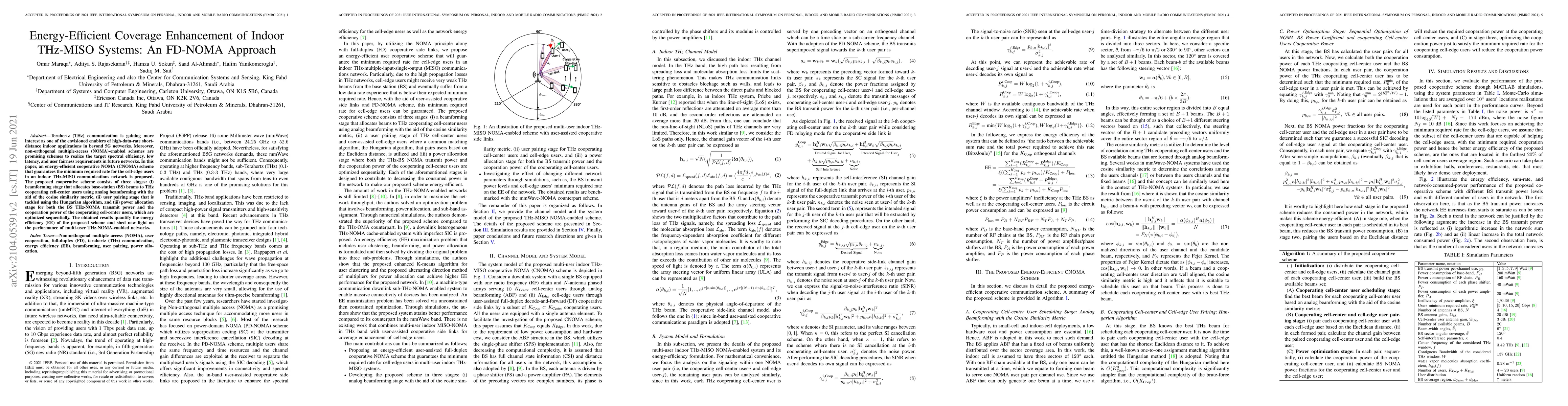 This paper proposes an energy-efficient cooperative NOMA scheme for indoor THz-MISO systems to enhance coverage for cell-edge users. The scheme optimizes beamforming, user pairing, and power allocation to achieve high spectral efficiency and user fairness, demonstrating improved energy efficiency.