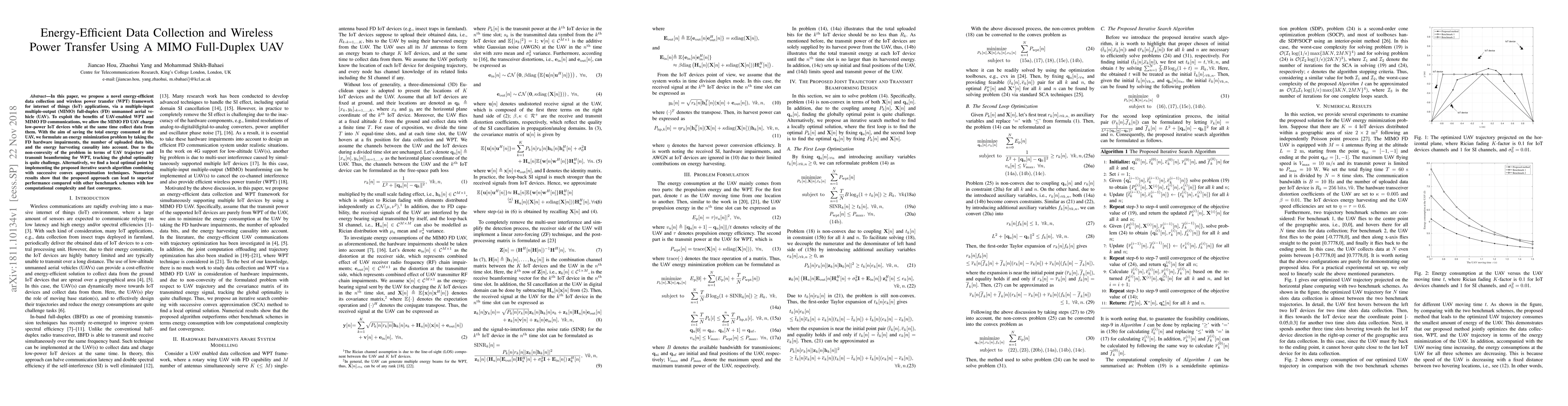 This paper proposes an energy-efficient framework for IoT applications using a MIMO full-duplex UAV that simultaneously collects data and wirelessly powers low-power devices. An iterative search algorithm with convex approximation techniques optimizes energy consumption despite non-convex problem challenges.