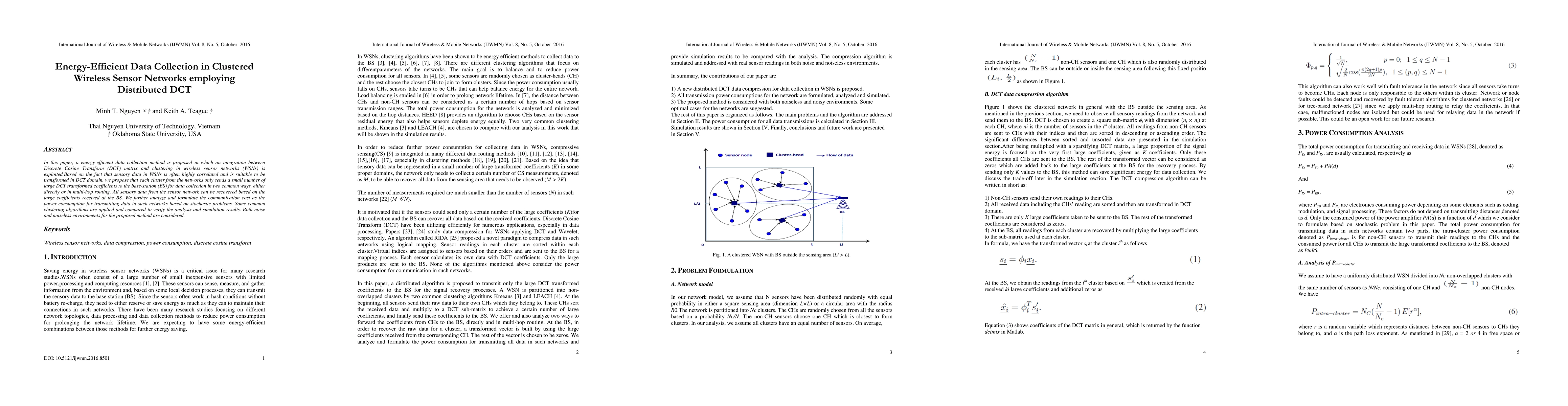 This paper proposes an energy-efficient data collection method in clustered wireless sensor networks using Distributed DCT, where clusters send only large DCT transformed coefficients to the base-station, reducing communication cost and power consumption. The method is analyzed and compared using common clustering algorithms in both noisy and noiseless environments.