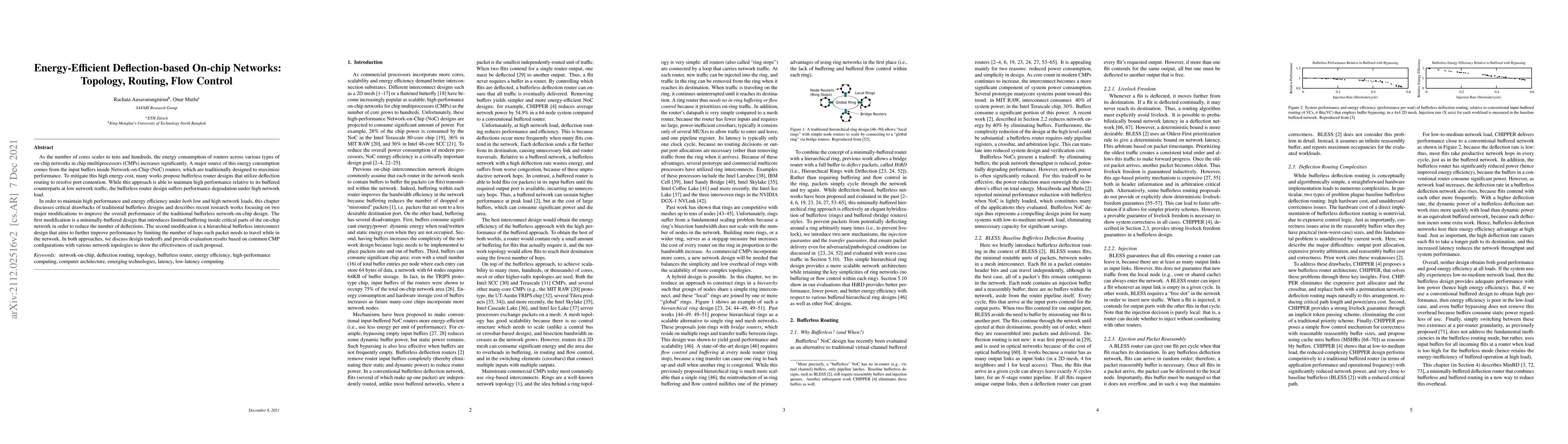 This paper explores energy-efficient deflection-based on-chip networks, addressing the high energy consumption in routers due to input buffers in Network-on-Chip (NoC) routers. It proposes two modifications: minimally-buffered designs to reduce deflections and hierarchical bufferless interconnects to limit packet travel hops, evaluating their effectiveness across various CMP configurations.