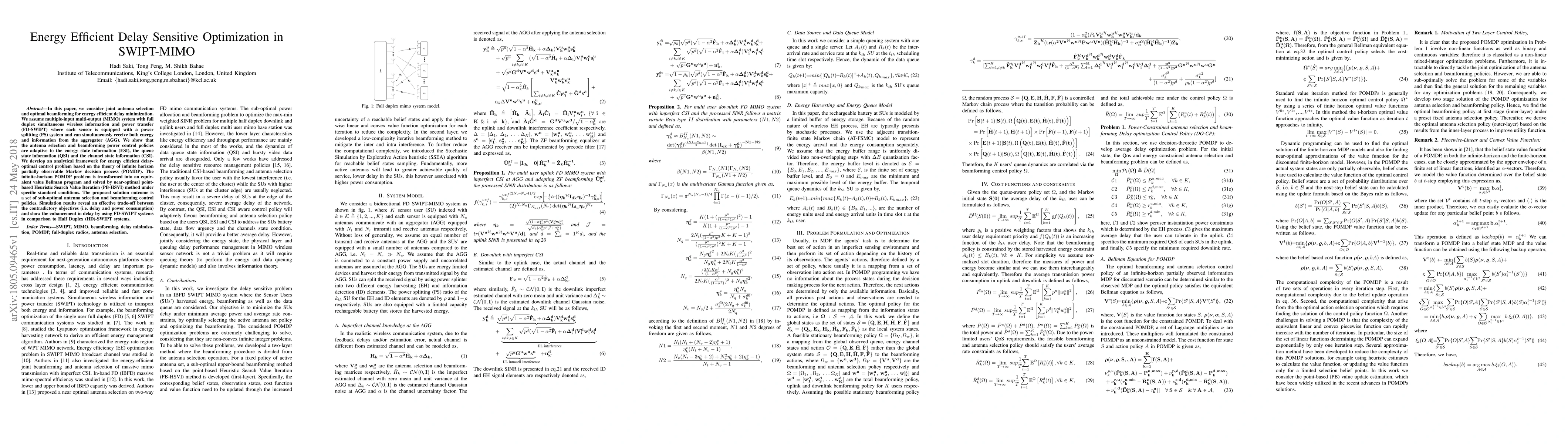 In this paper, we consider joint antenna selection and optimal beamforming for energy efficient delay minimization. We assume multiple-input multi-output (MIMO) system with full duplex simultaneous wireless information and power transfer (FD-SWIPT) where each sensor is equipped with a power splitting (PS) system and can simultaneously receive both energy and information from the aggregator (AGG). We show that the antenna selection and beamforming power control policies are adaptive to the energy state information (ESI), the queue state information (QSI) and the channel state information (CSI). We develop an analytical framework for energy efficient delay-optimal control problem based on the theory of infinite horizon partially observable Markov decision process (POMDP). The infinite-horizon POMDP problem is transformed into an equivalent value Bellman program and solved by near-optimal point-based Heuristic Search Value Iteration (PB-HSVI) method under specific standard conditions. The proposed solution outcome is a set of sub-optimal antenna selection and beamforming control policies. Simulation results reveal an effective trade-off between the contradictory objectives (i.e. delay and power consumption) and show the enhancement in delay by using FD-SWIPT systems in comparison to Half Duplex (HD)-SWIPT systems.