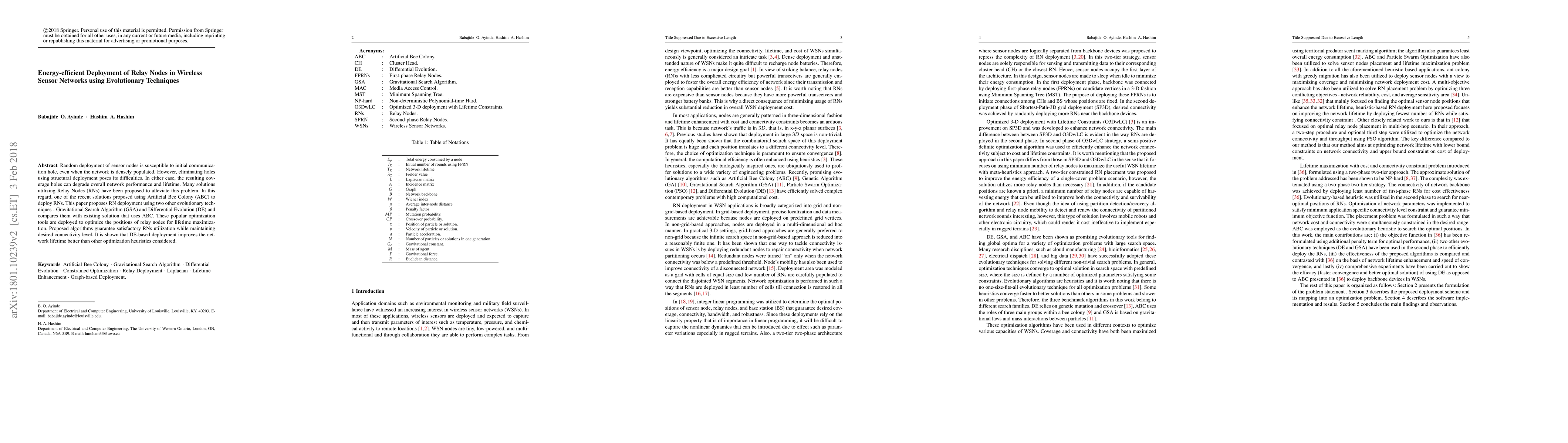 Random deployment of sensor nodes is susceptible to initial communication hole, even when the network is densely populated. However, eliminating holes using structural deployment poses its difficulties. In either case, the resulting coverage holes can degrade overall network performance and lifetime. Many solutions utilizing Relay Nodes (RNs) have been proposed to alleviate this problem. In this regard, one of the recent solutions proposed using Artificial Bee Colony (ABC) to deploy RNs. This paper proposes RN deployment using two other evolutionary techniques - Gravitational Search Algorithm (GSA) and Differential Evolution (DE) and compares them with existing solution that uses ABC. These popular optimization tools are deployed to optimize the positions of relay nodes for lifetime maximization. Proposed algorithms guarantee satisfactory RNs utilization while maintaining desired connectivity level. It is shown that DE-based deployment improves the network lifetime better than other optimization heuristics considered.