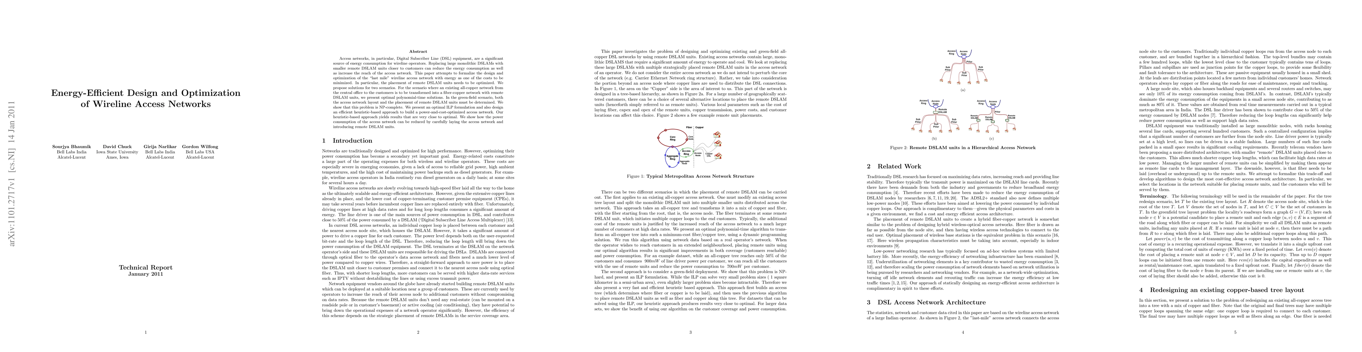 Access networks, in particular, Digital Subscriber Line (DSL) equipment, are a significant source of energy consumption for wireline operators. Replacing large monolithic DSLAMs with smaller remote DSLAM units closer to customers can reduce the energy consumption as well as increase the reach of the access network. This paper attempts to formalize the design and optimization of the "last mile" wireline access network with energy as one of the costs to be minimized. In particular, the placement of remote DSLAM units needs to be optimized. We propose solutions for two scenarios. For the scenario where an existing all-copper network from the central office to the customers is to be transformed into a fiber-copper network with remote DSLAM units, we present optimal polynomial-time solutions. In the green-field scenario, both the access network layout and the placement of remote DSLAM units must be determined. We show that this problem is NP-complete. We present an optimal ILP formulation and also design an efficient heuristic-based approach to build a power-and-cost-optimized access network. Our heuristic-based approach yields results that are very close to optimal. We show how the power consumption of the access network can be reduced by carefully laying the access network and introducing remote DSLAM units.