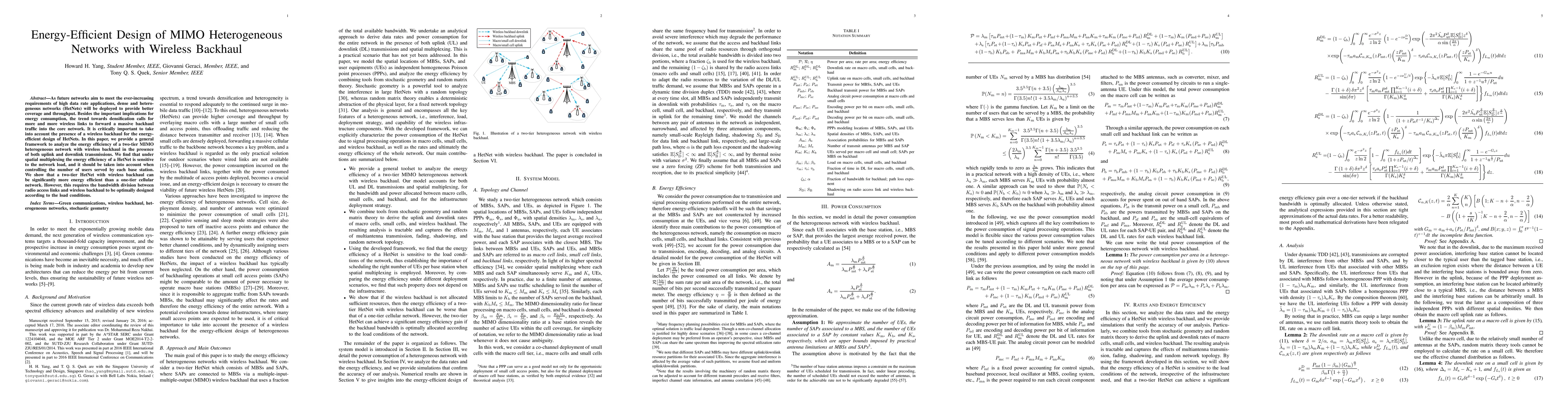 This paper presents a framework for analyzing the energy efficiency of two-tier MIMO heterogeneous networks with wireless backhaul, showing that such networks can be more energy efficient than traditional cellular networks if the bandwidth allocation between radio access and backhaul is optimized based on network load. The study highlights the importance of considering network load when managing user distribution among base stations.