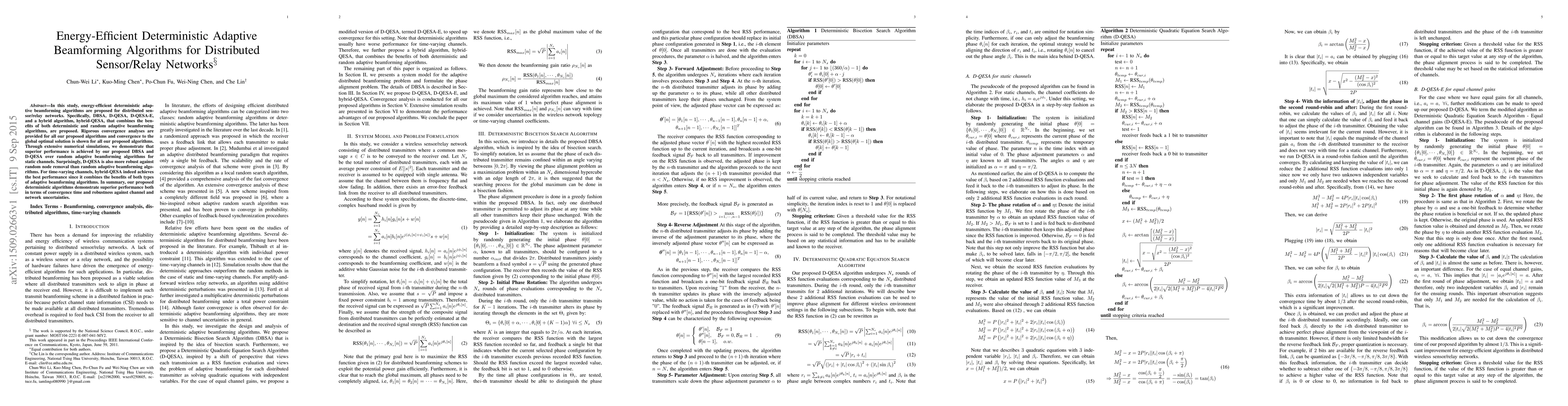 This paper proposes energy-efficient deterministic adaptive beamforming algorithms for distributed sensor/relay networks, including DBSA, D-QESA, D-QESA-E, and hybrid-QESA. The algorithms show superior performance and convergence to the global optimal solution, especially DBSA and D-QESA in static channels and hybrid-QESA in time-varying channels.