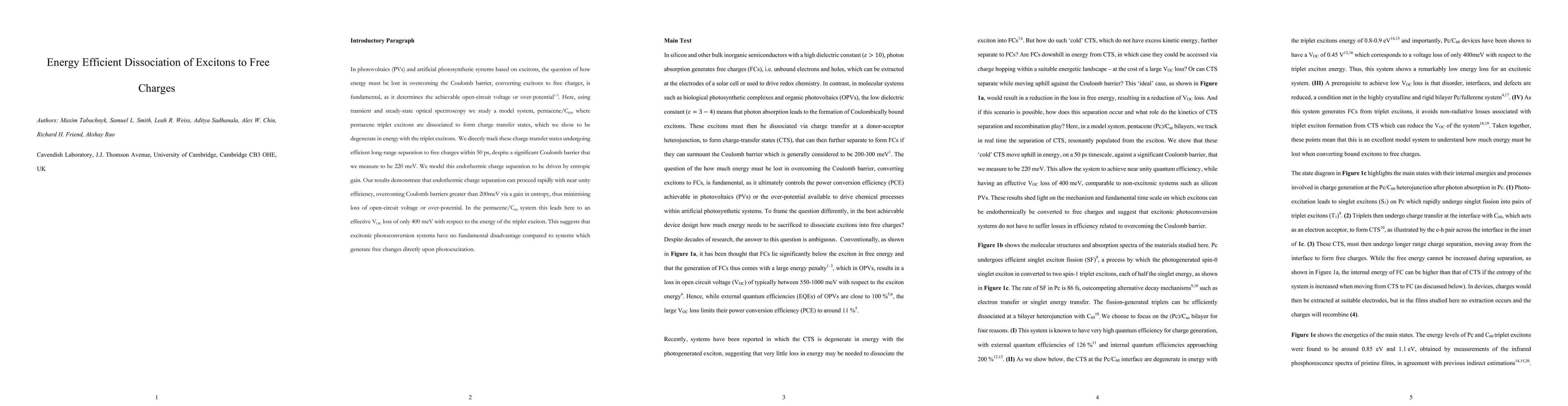 Researchers developed a method to efficiently separate excitons into free charges with minimal energy loss, overcoming significant Coulomb barriers with near unity efficiency. This breakthrough could significantly improve the performance of photovoltaic systems and artificial photosynthetic systems.