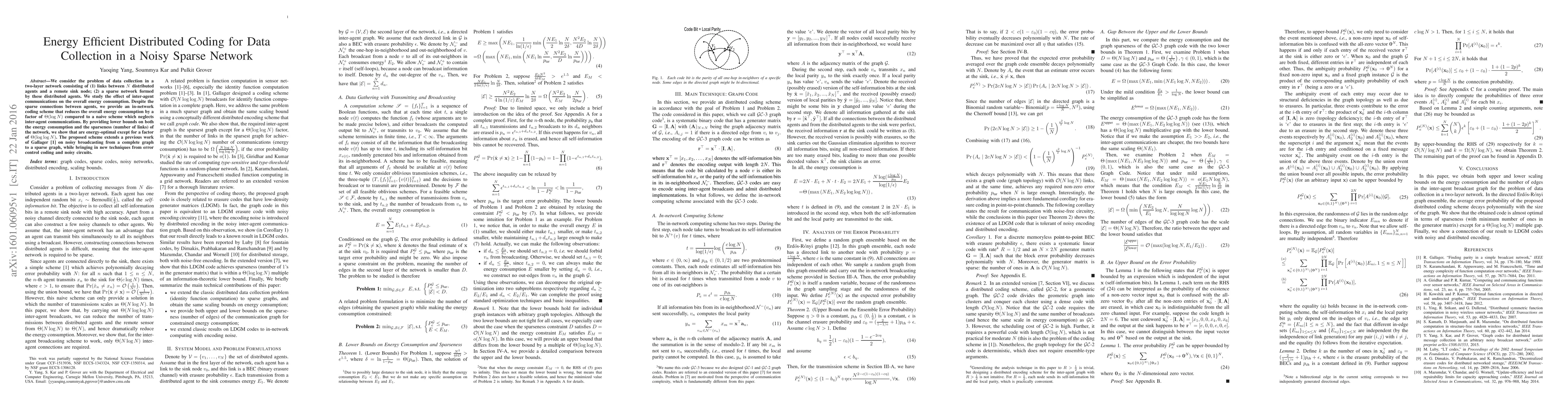 This paper proposes an energy-efficient distributed coding scheme for data collection in a sparse network, reducing energy consumption by a factor of $\Theta(\log N)$ compared to traditional methods. The scheme leverages inter-agent communications and extends Gallager's work on noisy broadcasting to sparse graphs, achieving near-optimal energy efficiency.
